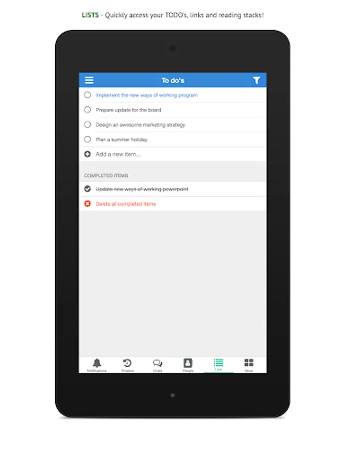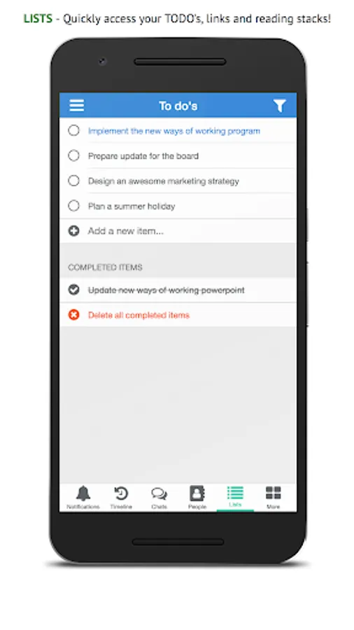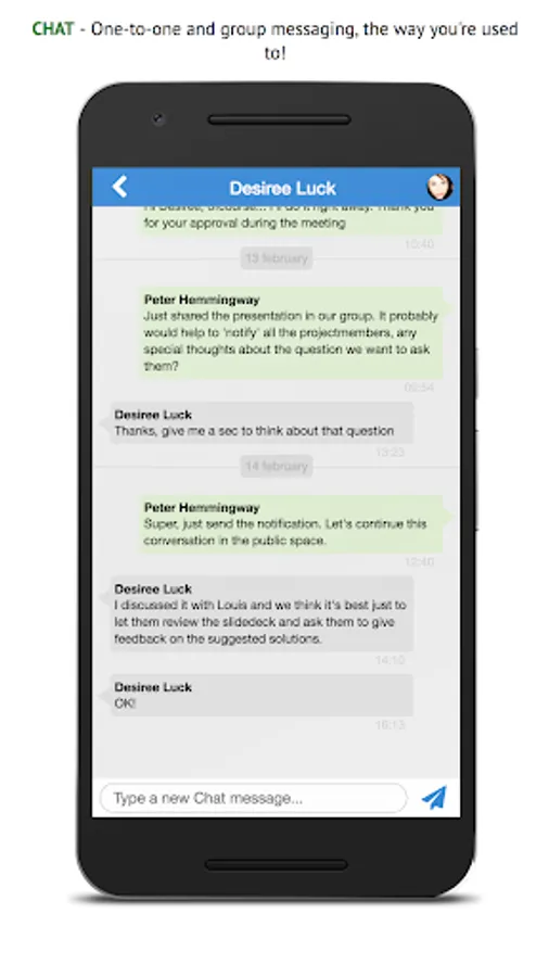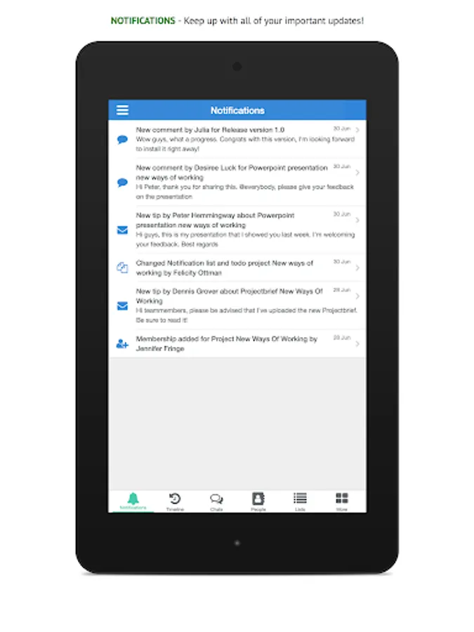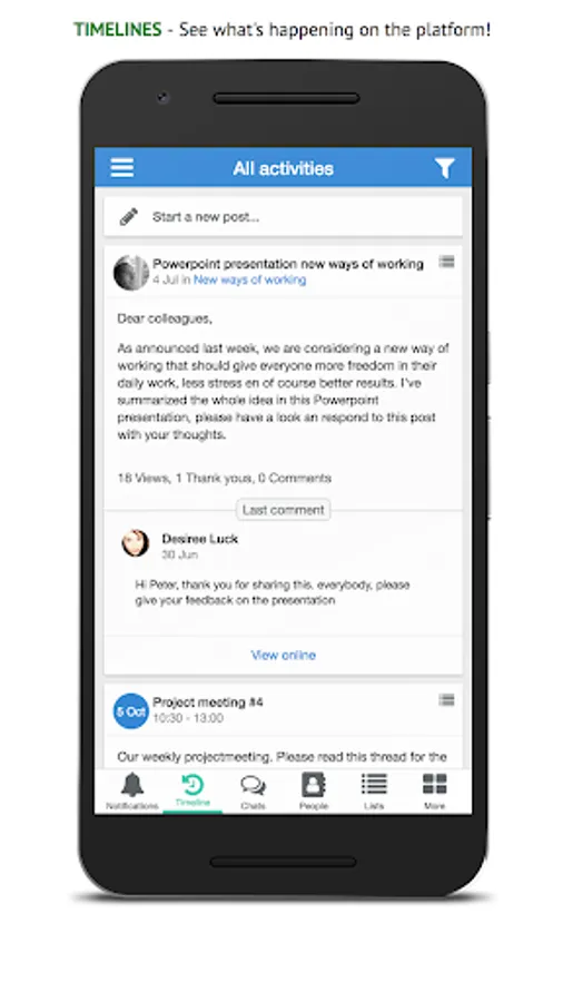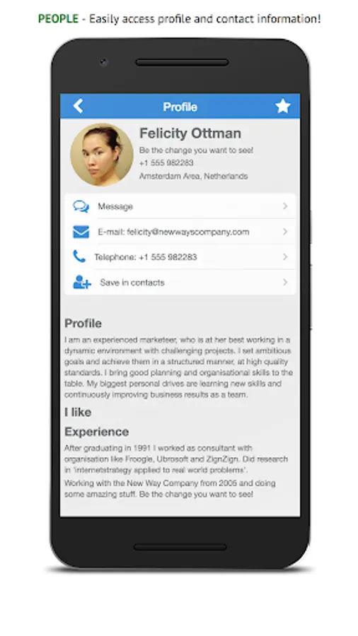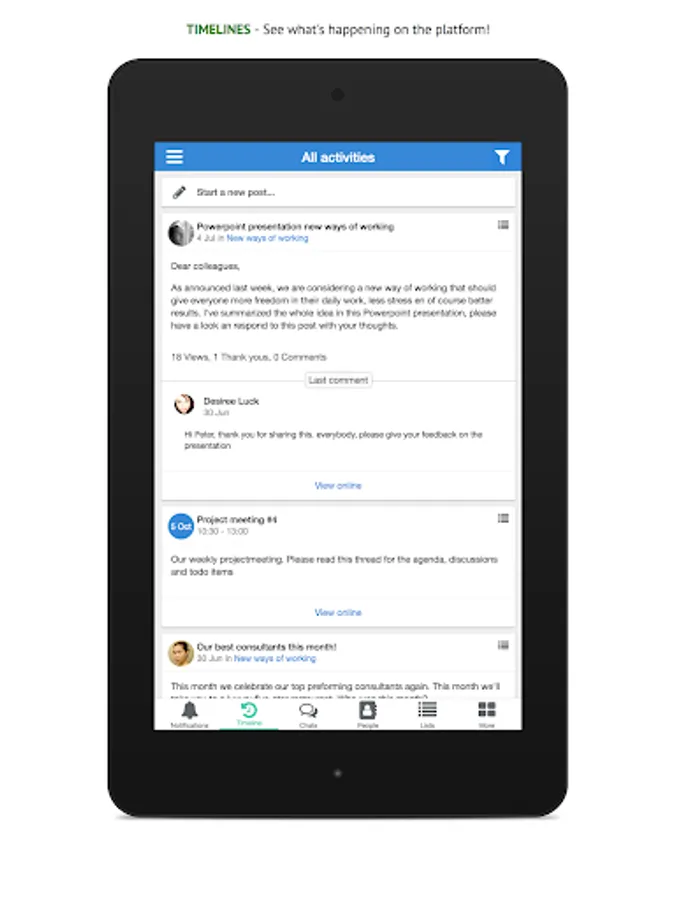 Post something in your group, check out your timeline, send a chat to a coworker or look up his / her contact information, it's all a matter of seconds with this app!