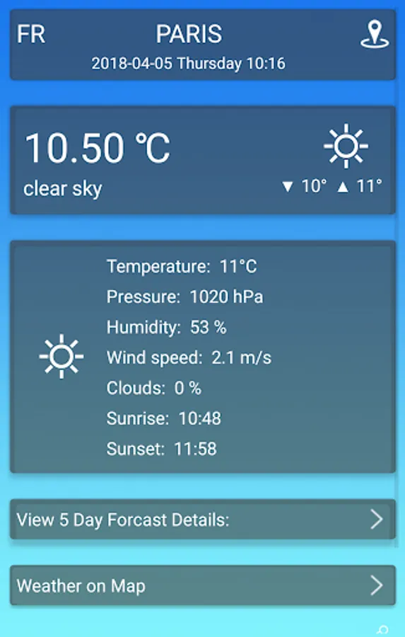 The Weather app is specifically designed to be as simple and intuitive as possible. With just one click you receive the weather data at your current location.