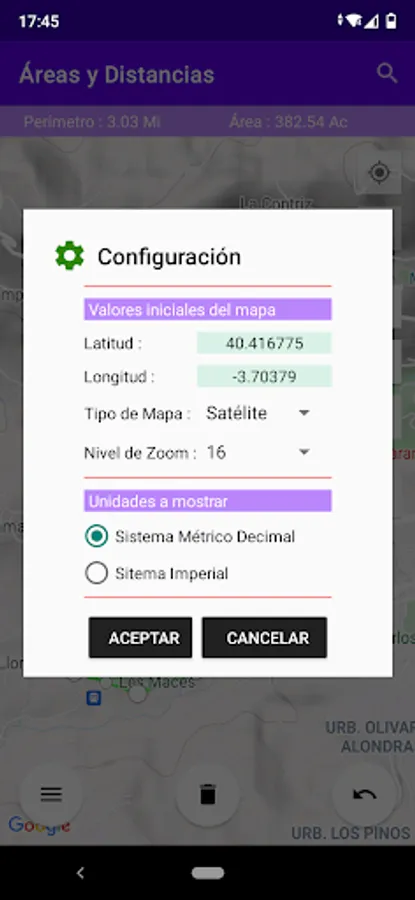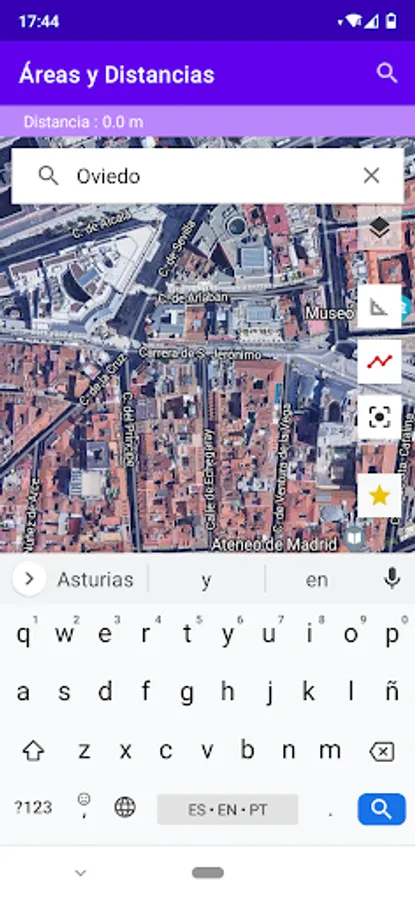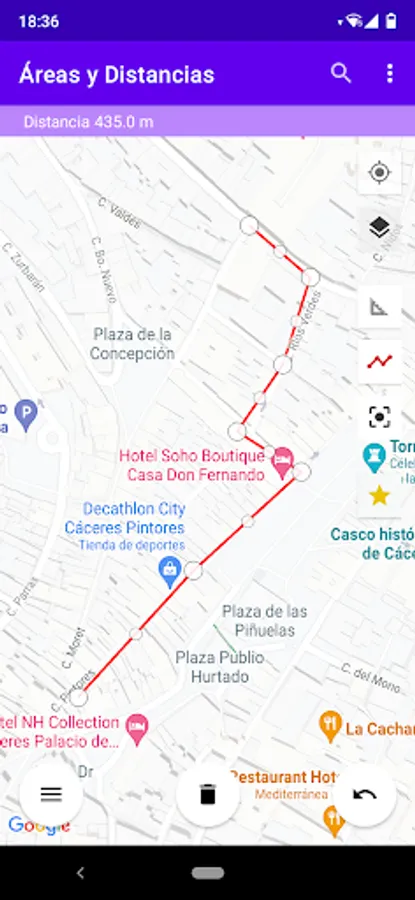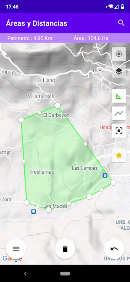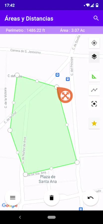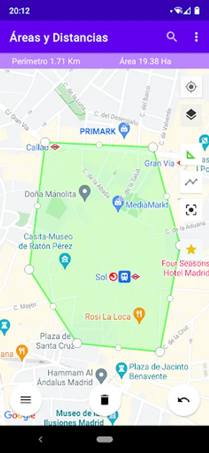 You can get the area and perimeter of any place by simply tapping the screen on different points on the map. The polygonal figure that contains the place to be measured can be easily modified and adapted by dragging any of the points of the polygon.
