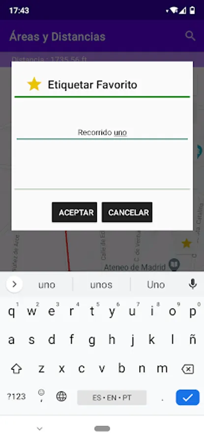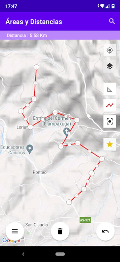 By touching the screen, the points on the map that form the route to be measured are created. It is also possible to modify the route once it has been created by dragging any of the points.