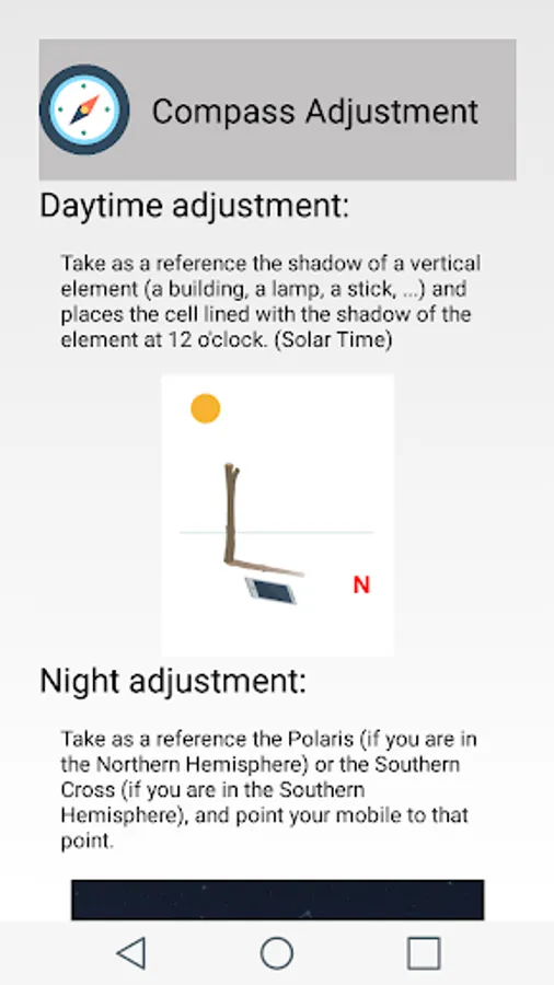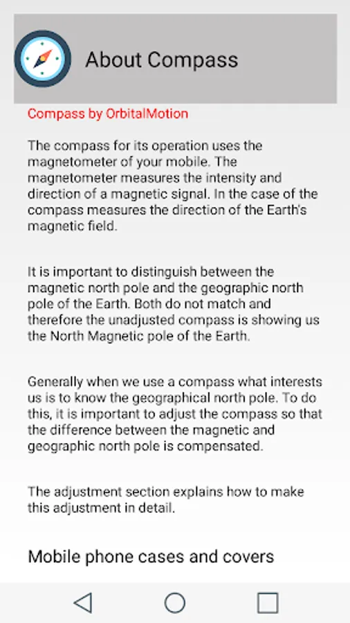 For proper operation it is advisable to make a simple adjustment of the compass, as by default all mobile magnetometers point to the Magnetic North Pole of the Earth and this does not match the Geographic North Pole. The application allows you to make this adjustment very easily.