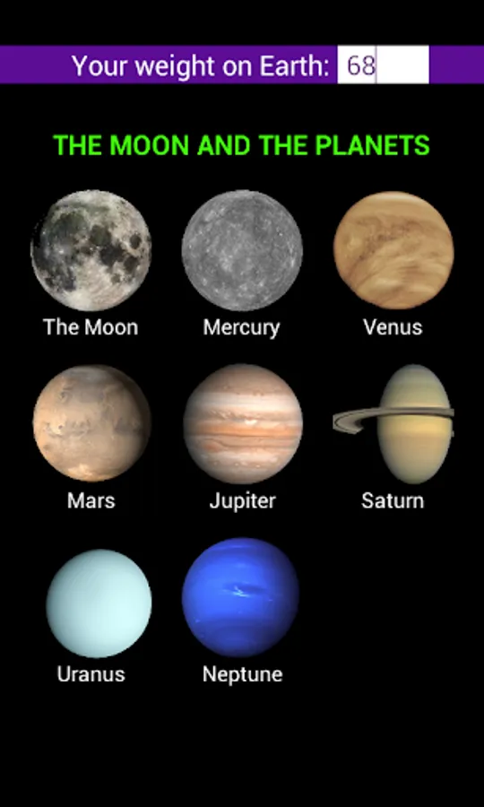 * The Solar System Planets: Mercury, Venus, Mars, Jupiter, Saturn, Uranus, Neptune.