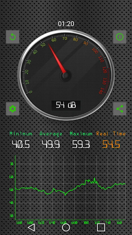 At the bottom it shows the evolution of the decibel level in a graph that allows great detail and that you can enlarge or reduce by touch (with two fingers on the screen).