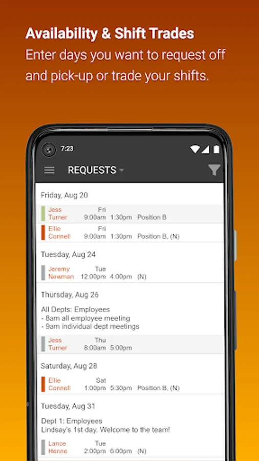 This free employee mobile app is a natively developed companion app to OrbitalShift's web-based staff scheduling and attendance management platform. As such, some software features may be restricted depending on your business settings set by account admins.