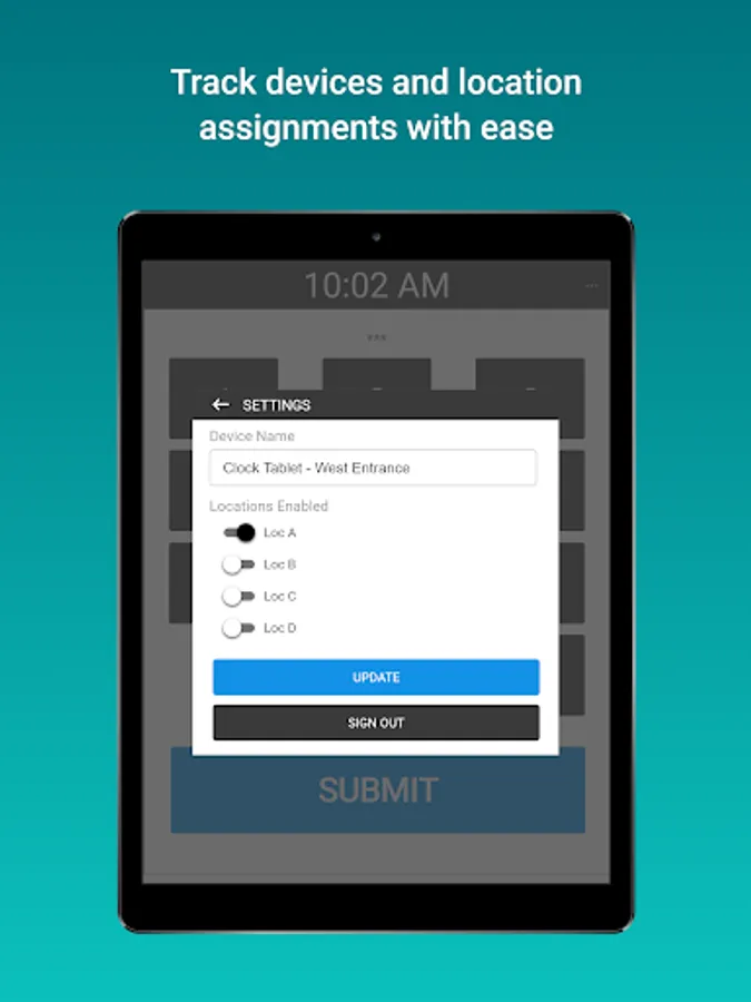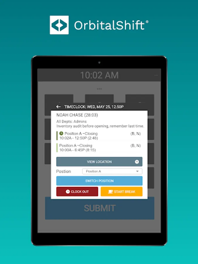 The OrbitalShift Punch Clock Kiosk is an easy time clock app that helps improve labor productivity and ensures accurate employee time tracking for businesses of any size. The Punch Clock Kiosk app allows employees to clock in and out of their shifts, take breaks and switch positions - all from easy-to-use, dedicated time clock kiosks.