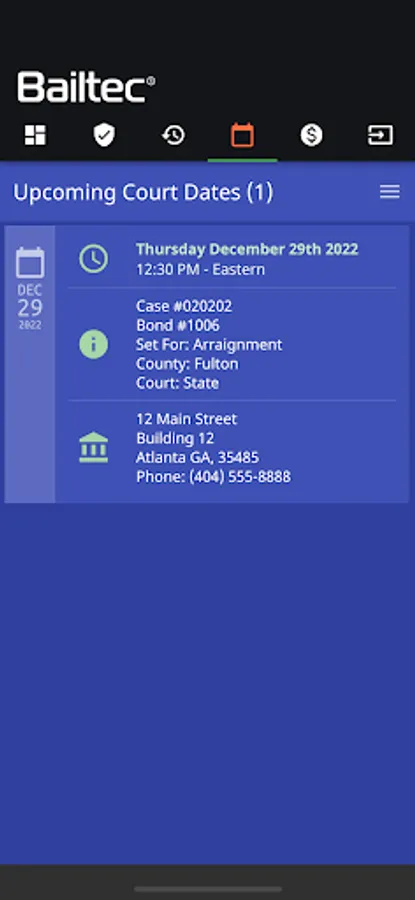 Upcoming Court Dates: View detailed information regarding all upcoming court appearances. View dates, times, court addresses and call the court clerk if needed.