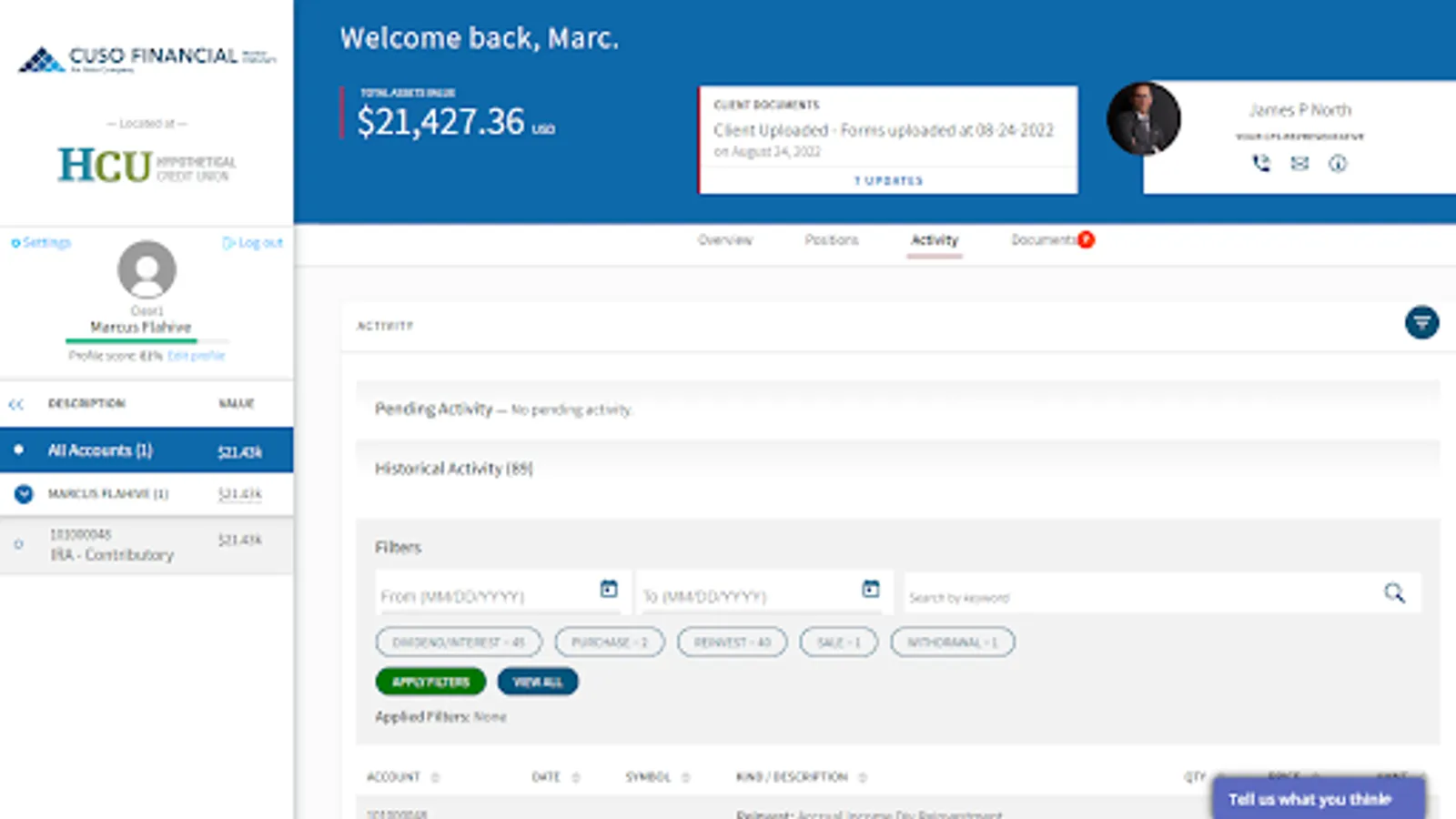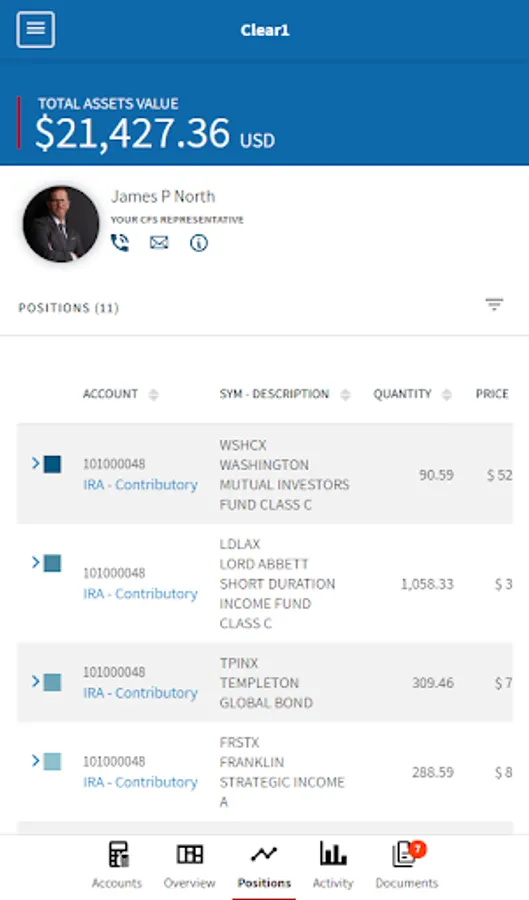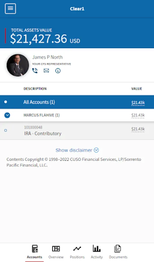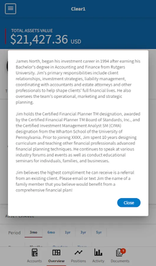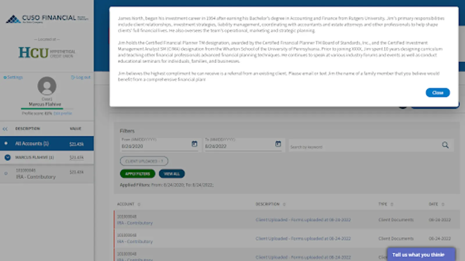- Contact your financial professional with one click phone / email or learn more about their practice and values