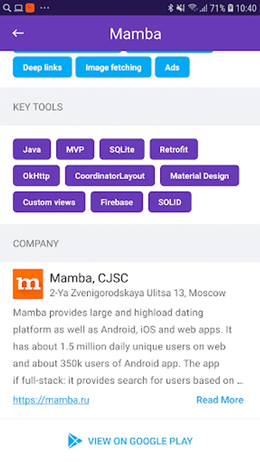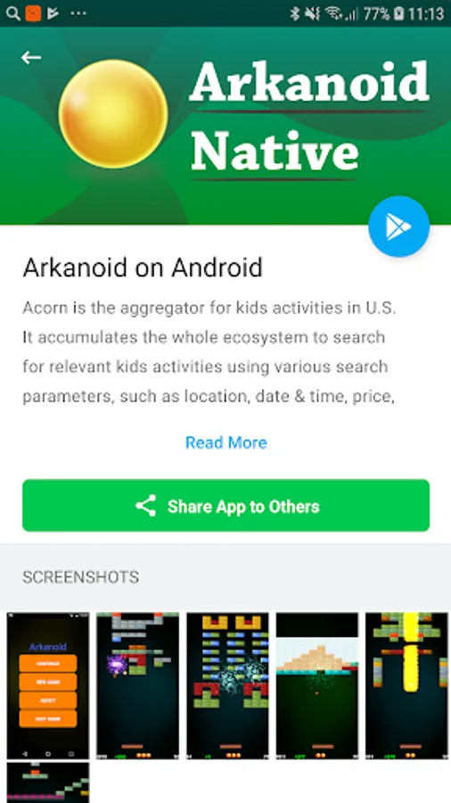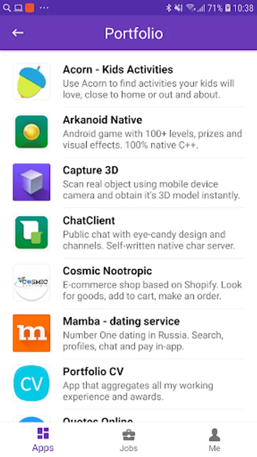 - The first screen shows list of my apps - some of them are my own, some of them I've written as being an employee. For each app one can read a listing and see screenshots.