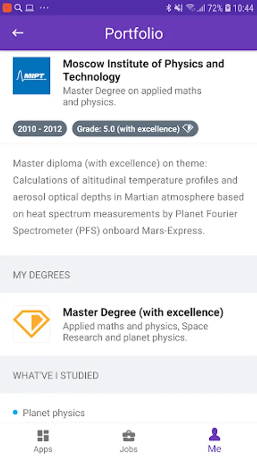 - The second screen shows list of my job companies. Also, read description about them as well as my responsibilities there, experience gain and awards.