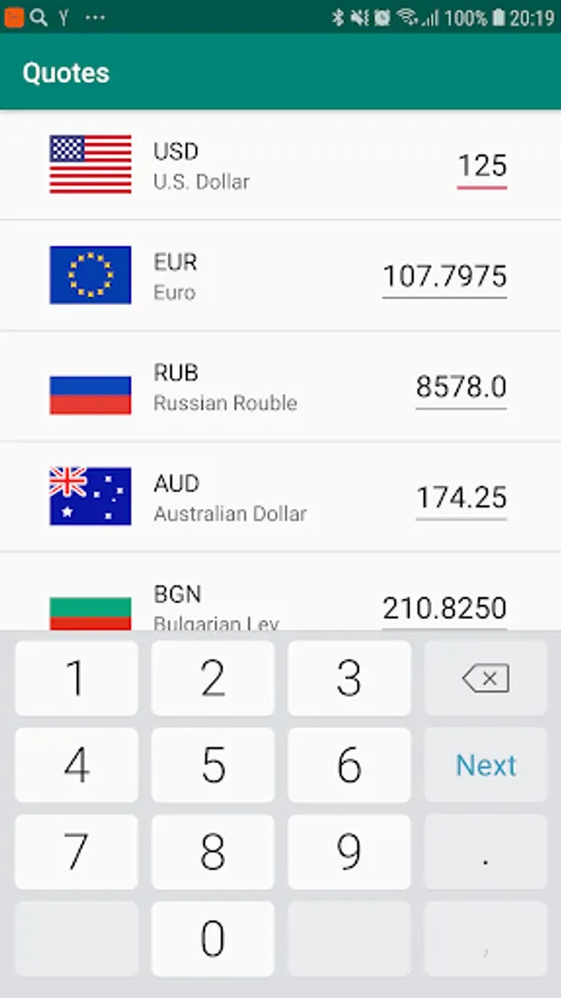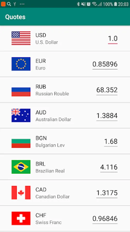 Application shows list of currencies with quotes. One can select any currency and get convertation rates between the selected one currency and the others. It's also possible to input some amount of selected currency to calculate how much is it in other currencies.