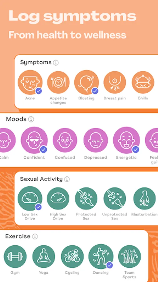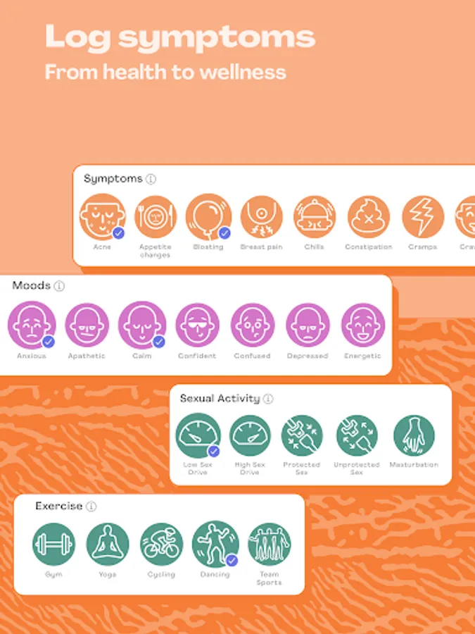 - Period calendar & log: Add symptoms for improved cycle predictions if you have irregular periods