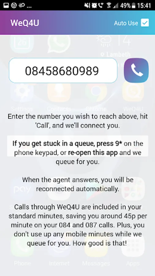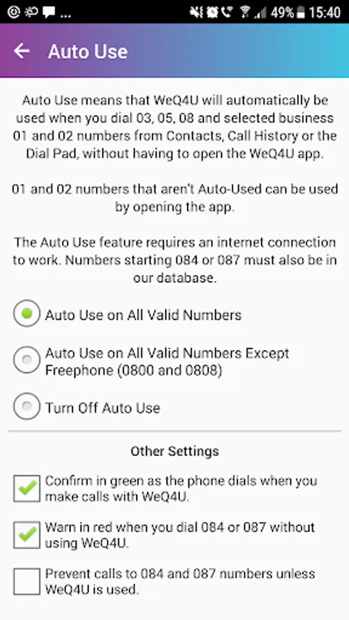 Auto Use can be disabled for 0800 (Freephone) calls which you might want to do if you don't get monthly contract minutes - tap the Auto Use checkbox to see all available settings. 01, 02 and 03 numbers that are not Auto Used can be called through WeQ4U by opening the app - but calling 03 numbers now requires an annual subscription, costing just £9.99.