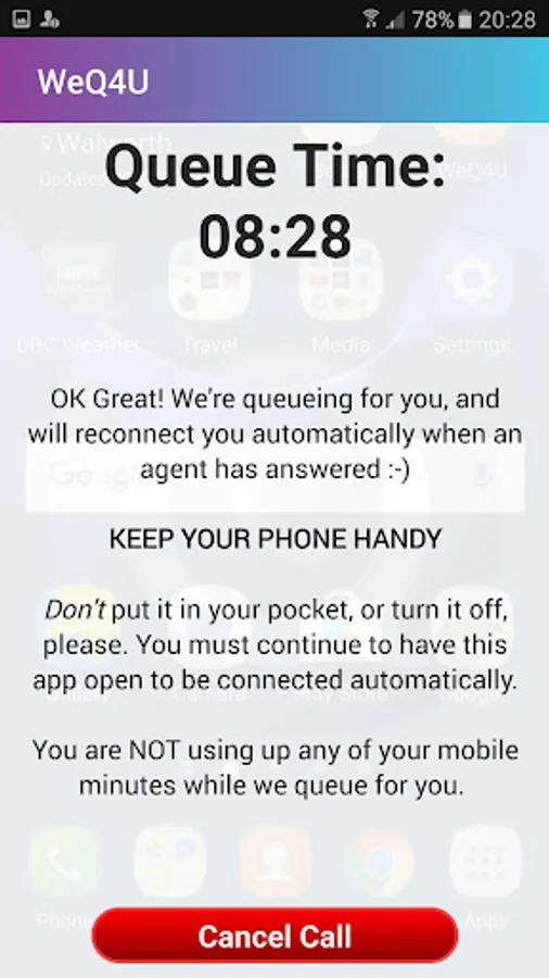 To use it, just enter the number you wish to reach and the app will connect you. If you get stuck in a queue, just press 9* on your telephone keypad, and your phone will disconnect from the call while we queue for you (hence the name).