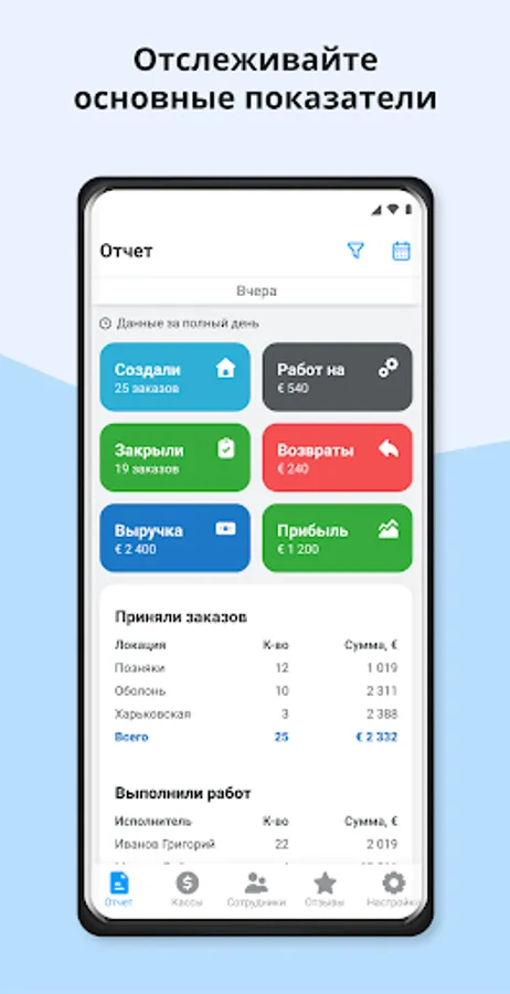 The report in the application allows you to control operational performance and finances: it shows the number of created and closed orders, work performed by each employee, sales of goods and payments made. And most importantly - you will see the company's revenue and profit per day.