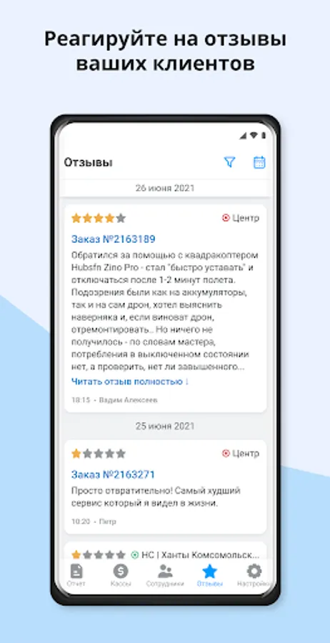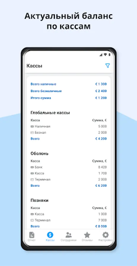 Track cash flow by locations, employees, orders and sales. All the most important data about the daily activities of your company is collected in one tab of the application.