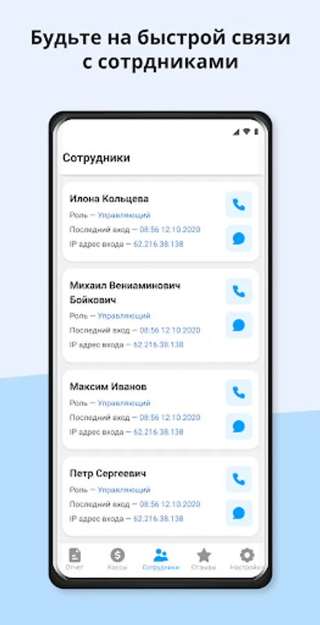 Got questions while viewing the report? You can easily set them to any employee, you don't even have to minimize the application. On a separate tab, you will find a list of all employees with the ability to call them or write a message. And by configuring the display of the IP address and time of the last entry of an employee into RemOnline, you can use the application as a manager's tool to control lateness.