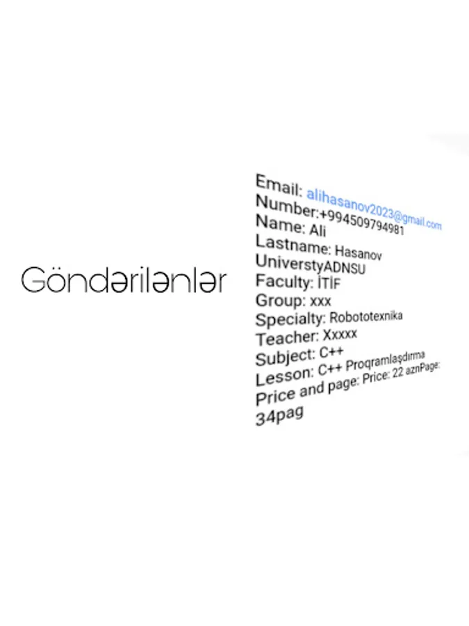 OrderX, Azərbaycan Təhsil ocağlarının tələbələri üçün modern , informativ , estetik slide sifarişlərini həyata keçirdir.App vasitəsi ilə göndərilən məlumatlar təhlil edilib , sifarişçi ilə əlaqə saxlanılır.Prosesin təhlükəsizliyini, sizə əlaqə vasitəsi ilə göndərəcəyimiz qaydaların razılaşılması təmin edəcəkdir.