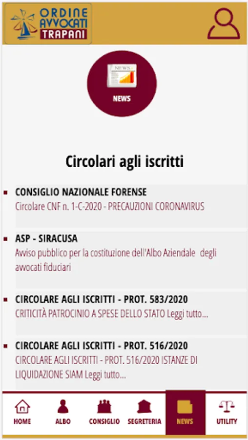 In addition to being a public consultation tool, the Order of the Lawyers of Trapani has the purpose of informing all the members of the register on all the news, with the possibility of enrolling in a reserved area to be contacted by the Secretariat for personal and / or global communications.
