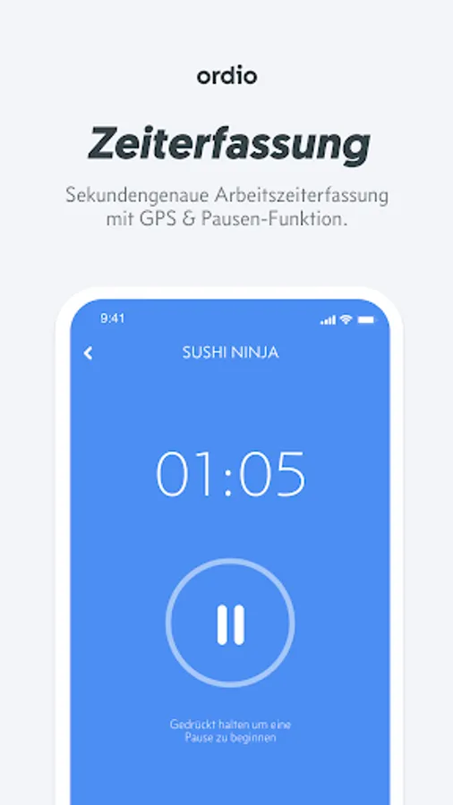 Your employees check in when they start work (check-in), record their breaks and end their working hours in the app. If necessary, with location-based restrictions (GPS) or a signature in the app as confirmation.