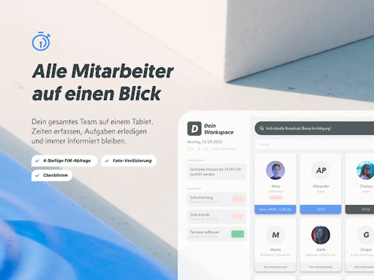 Ordio Terminal is the tablet app for Ordio Workspaces. From now on, your team will manage itself. From task management and availability to shift planning and time recording. In the terminal version of Ordio, your employees can view and edit checklists, record working times (shift-bound or shift-independent) and view broadcasts (notifications).