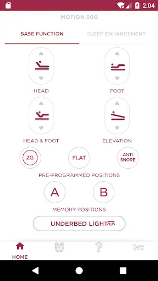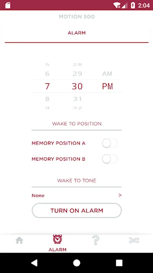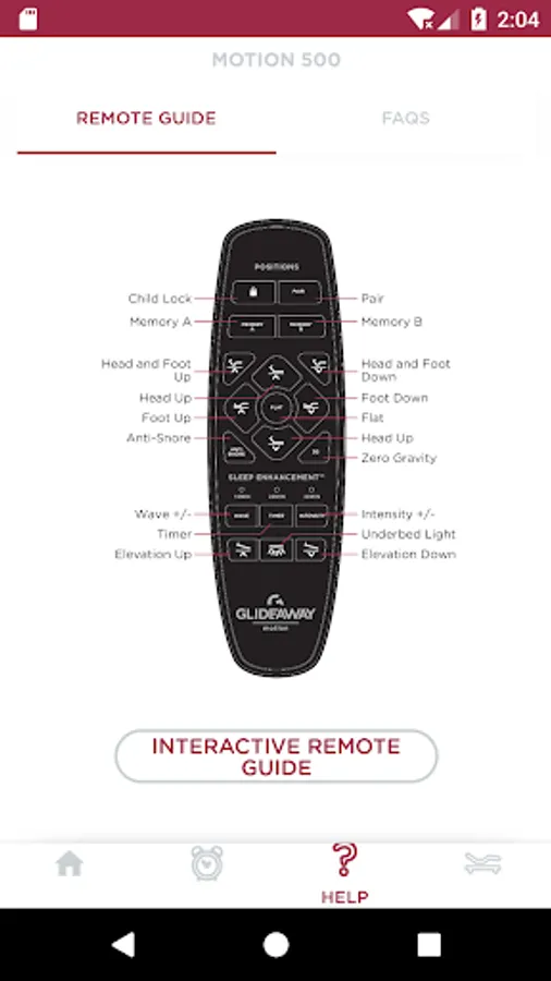 The Glideaway Motion application allows you to operate your bed from your smartphone or tablet when connected to Bluetooth. The application also allows you to set an alarm to wake you