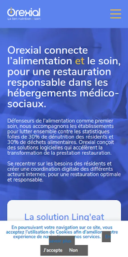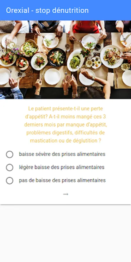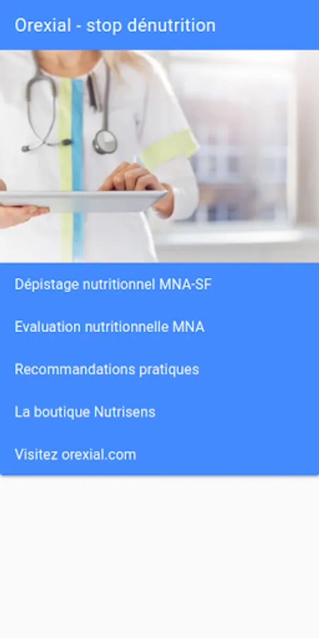 Are you a health professional and you provide patient follow-up at home or in an establishment? The Orexial application is the tool you need to perform the essential malnutrition screening that your patients' vulnerability requires: with a few clicks and without collecting personal data, you can calculate the risk of malnutrition and its severity. means of recognized scorings. MNA®-SF, MNA® or BMI calculation allow you to identify if your patient is at risk. Based on the calculated score, the application provides you with simple recommendations to share with your patient: written by the teams of dieticians / nutritionists of our partner Nutrisens, they remind you of the simple actions to take to quickly control this risk; and thus help to keep your patient in good health.