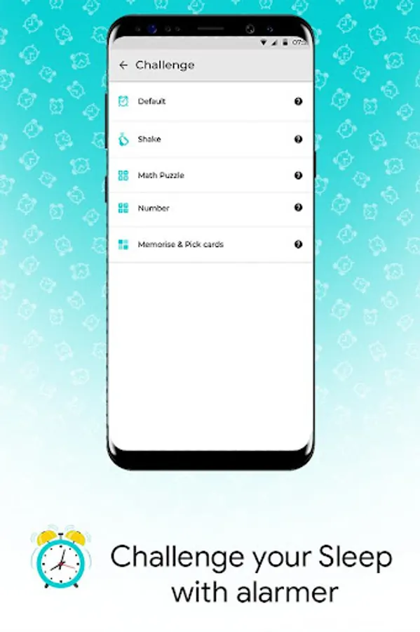 - Memorise Challenge: To turn off the alarm clock, select the green cards according to your first view of that card board.