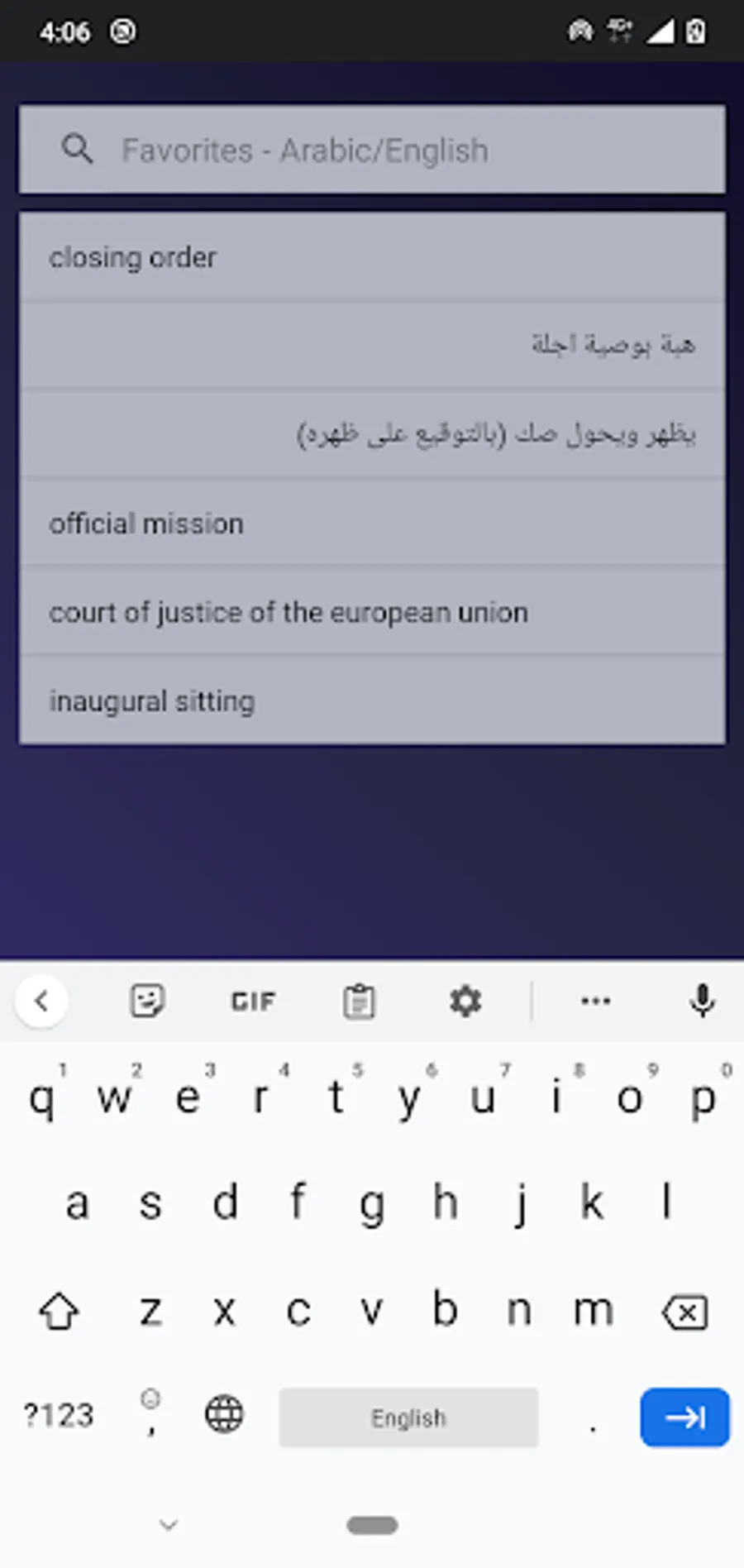 سيساعدنا القاموس القانوني ايضاً على حفظ وتذكر الكلمات والمصطلحات عن طريق اختيار كلمات عربية وانجليزية بصورة تلقائية عند الضغط على زر "تلقائي" وسيجلب لنا القاموس الكلمة ومعناها ثم بعد ذلك نستطيع اضافة هذه الكلمات لقائمة المفضلة لنسترجعها فيما بعد.