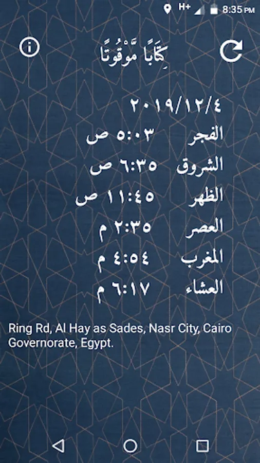This application aims to determine the prayer times with extreme accuracy from anywhere inside Egypt, even if in the desert, so perhaps if you are in East Cairo, for example, you will find a minute or two different in the same application for some times than if you are in West Cairo, and this is normal because the application calculates prayer times Depending on your phone's exact location and we've seen if you're in a populated place you always have to wait for the muezzin to complete the call to prayer.