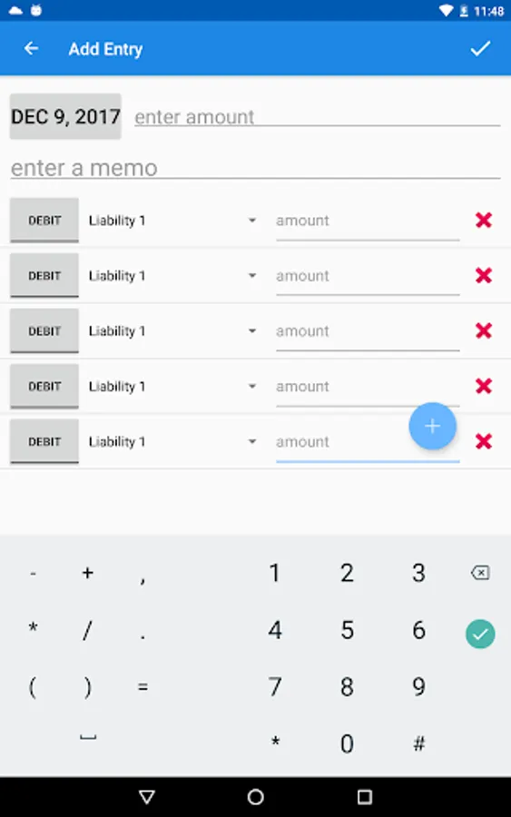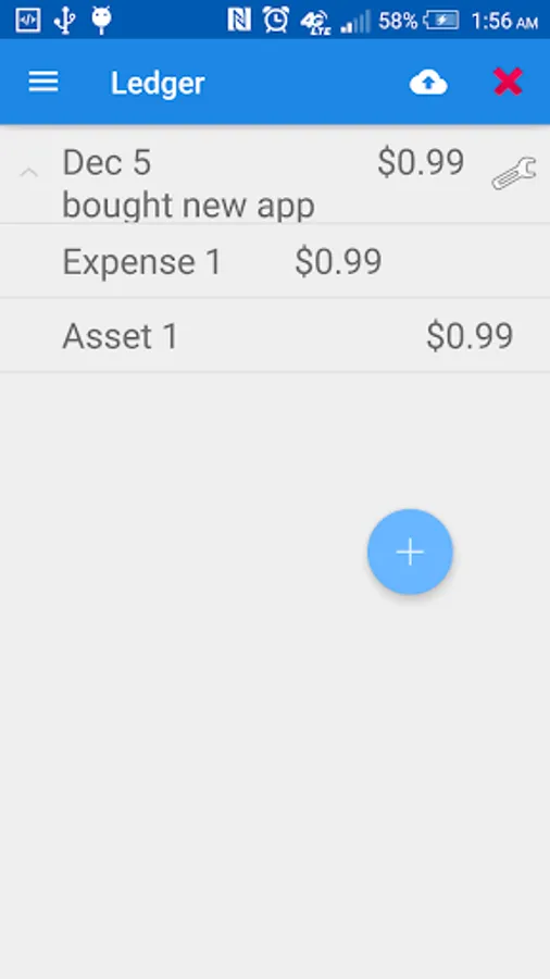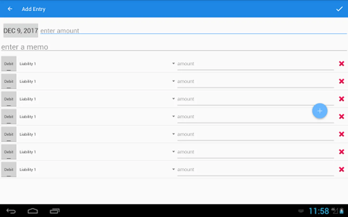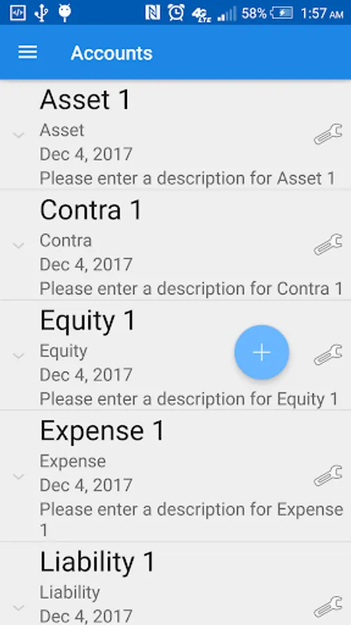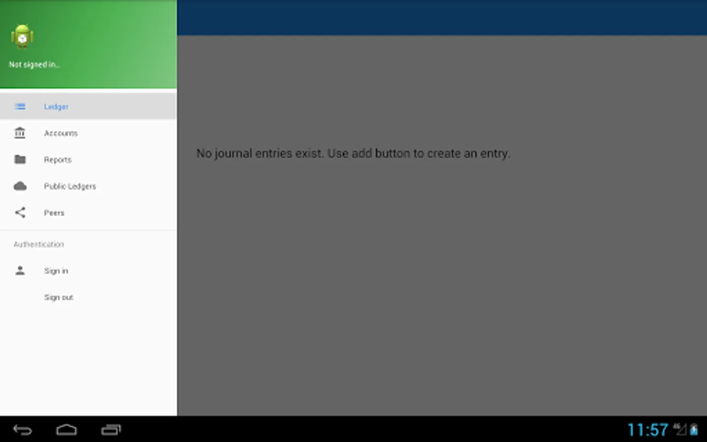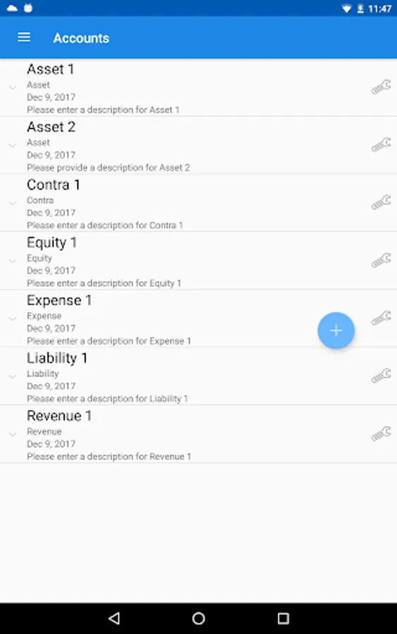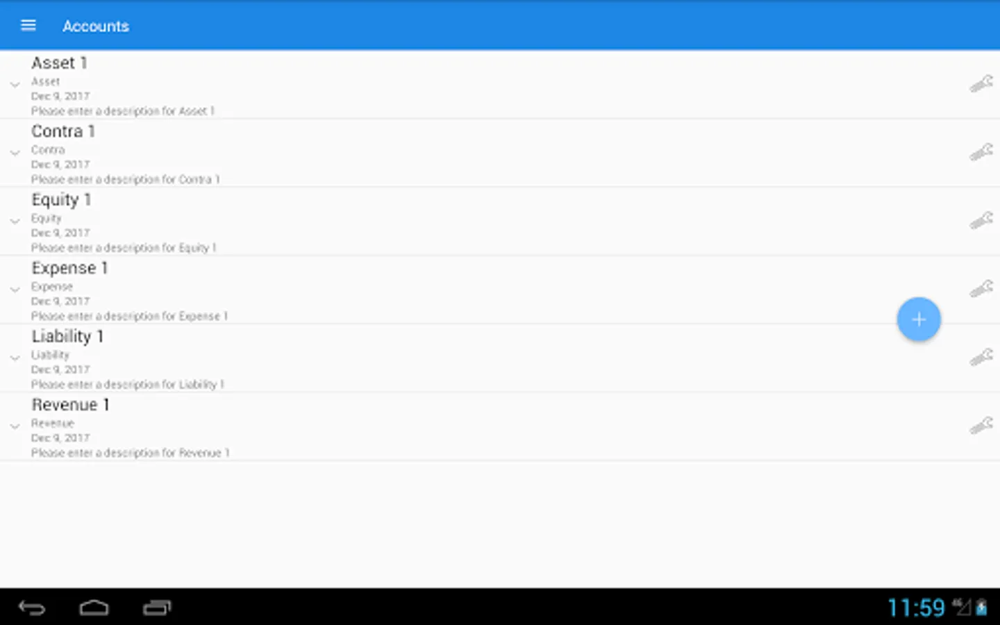 This is an app for general ledger accounting entry. The app supports creating ledger accounts and creating double-sided entries. You can export to standard comma separated value (.csv) file format. Share exported files from within the app or copy them directly from external storage when the device is connected to your computer.