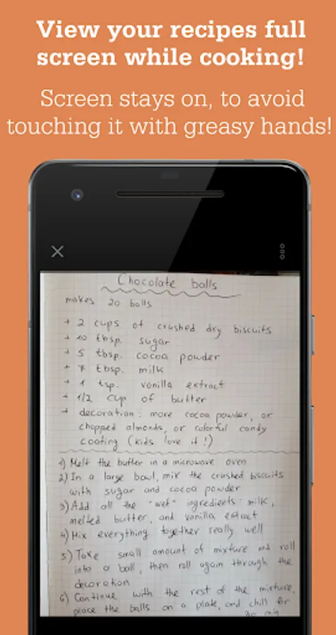 With OrganizEat, convenience is paramount. Our user-friendly interface ensures you can view your recipes easily, even while cooking. No need to worry about touching your device with greasy hands. We've included a screen that stays on, ensuring smooth navigation and easy access to your recipe keeper box.