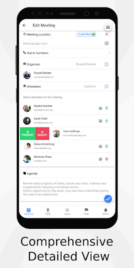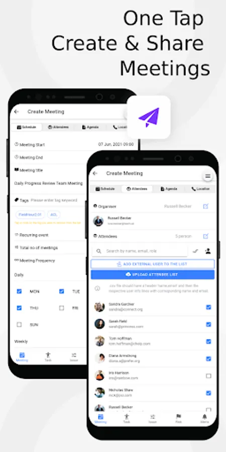Once the meeting is done, organizer can mark the attendance of the present members and also share the Minutes of Meeting instantly which is delivered as a document to respective mails.