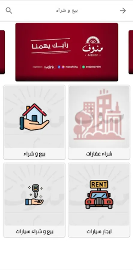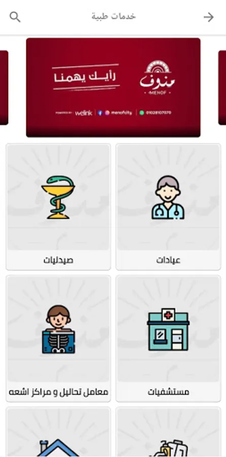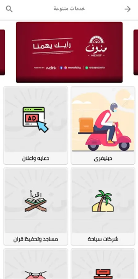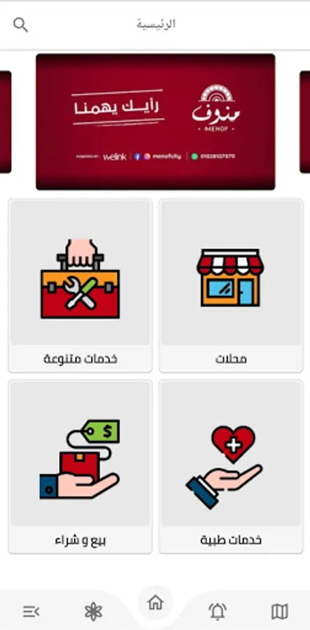 تطبيق دليـل المنوفية ابليكيشن مجاني بيقدملك دليل ديجيتال شامل للخدمات و الأنشطة التجارية و الطبية والانشطة الحكومية في ابلكيشن واحد , اكثر من 2500 محل وعيادة في كل التخصصات في منوف و شبين الكوم و مدينة السادات و سرس الليان وكل القري التابعة لهم وقريبا في اشمون و الباجور و الشهداء و قويسنا و بركة السبع و تلا وهدفنا نغطي محافظة المنوفية كلها ان شاء الله