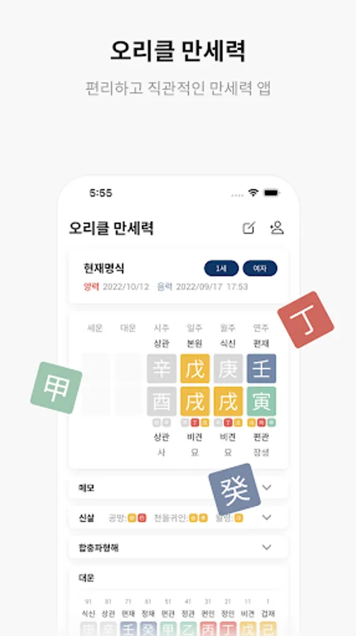 - It provides accurate analysis of Daewoon, Sewoon, Wolun, and Hapchunghyeongpae and Shinsal.