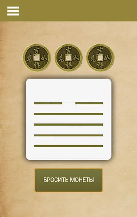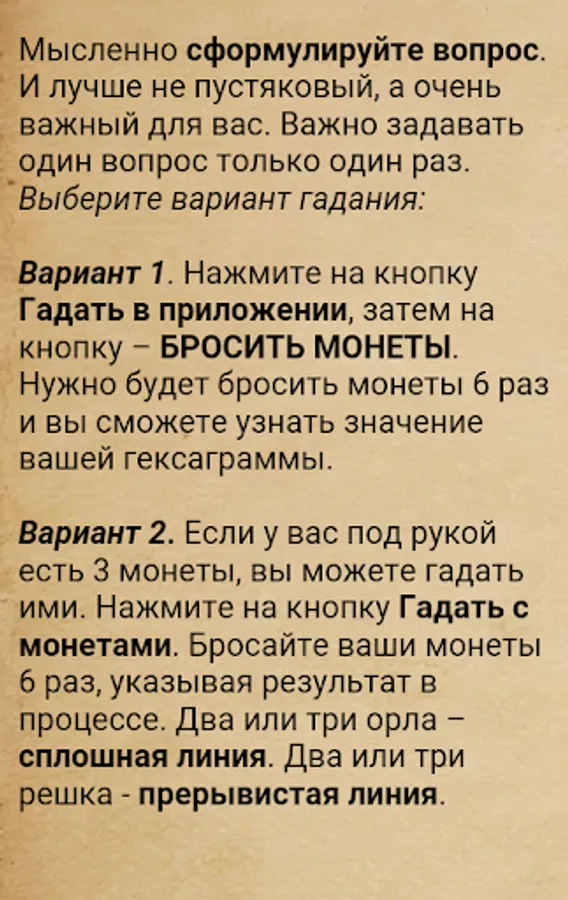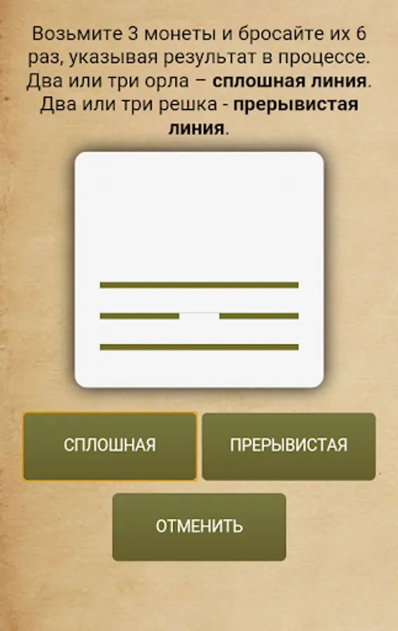 Option two. Having 3 coins at hand, you can guess with them, just select the item Guess with coins from the menu. Throw coins 6 times, writing down the result as you go. Two or three heads is a solid line, and two or three tails is a dashed line.