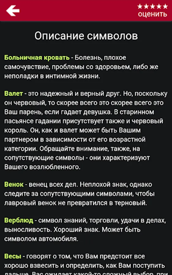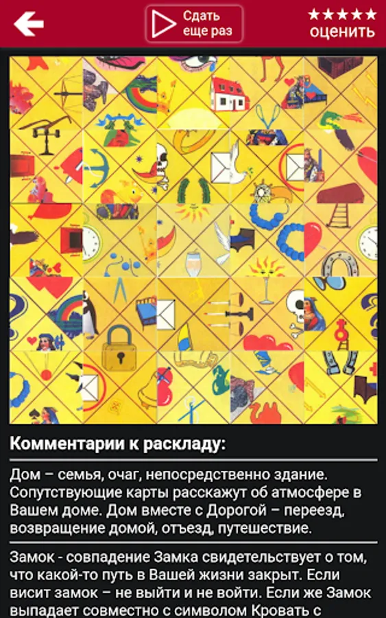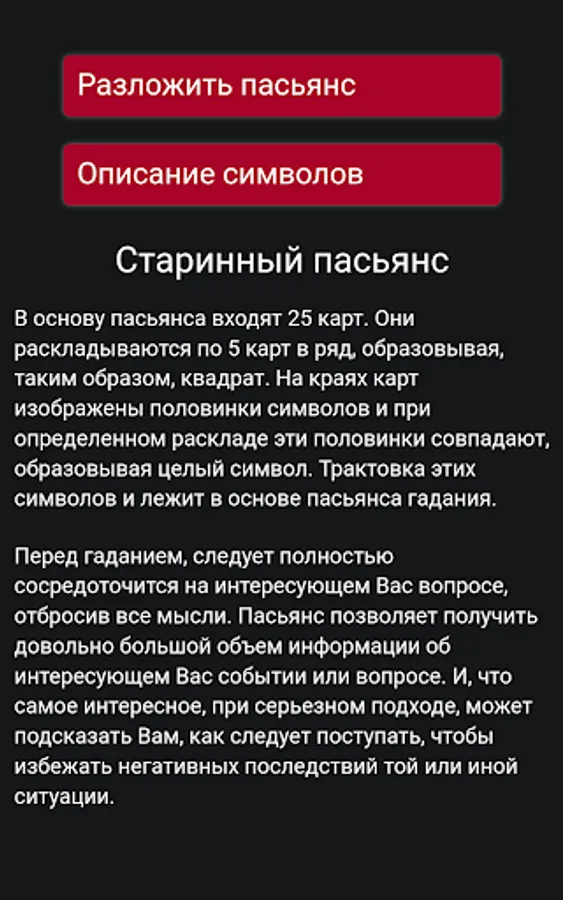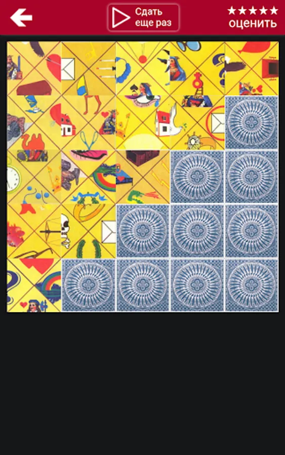Ancient Solitaire is an unusual way of fortune telling, it is also called Indian Solitaire fortune telling. This fortune-telling is a reflection of popular wisdom, its symbols are close and understandable to every person and come from life situations, and not from the magic of magic, the interpretation of some other fortune-telling. Fortune-telling reflects popular wisdom and most reflects our reality. This is a fortune-telling to which popular rumor attributes the property of reflecting the present and predicting the future. Fortune-telling solitaire consists of 25 cards. Cards are laid out in 5 pieces in each row, it turns out, 5 rows of 5 cards. On the edges of the cards are halves of various symbols. When these halves coincide, and a whole symbol is formed, an interpretation of the coincident symbols appears, which is the basis of solitaire. Before guessing, clear your thoughts and ask a question or think about the event you want to guess at, you need to fully concentrate on the problem of interest. With a serious approach, fortunetelling will be able to tell you what to do in order to avoid unpleasant consequences in various situations.