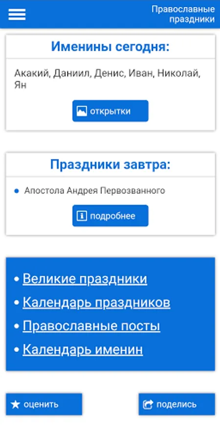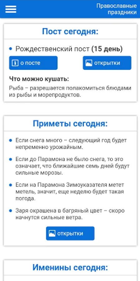 Absolutely free application with postcards, Orthodox (church) holidays, fasting, name days and signs, will help you always keep abreast of Orthodox events, as well as congratulate loved ones and friends with postcards. No need to search anymore, ask someone when this or that holiday will be. We did it for you. A convenient calendar of all Orthodox holidays will tell you about the upcoming holiday, and you can also refresh your memory of its meaning. The Great Orthodox Holidays are highlighted separately. You will be able to prepare in advance for especially significant events of the Christian people. You will know when the fast starts and ends. As well as folk signs, what they carry in themselves and what to expect.