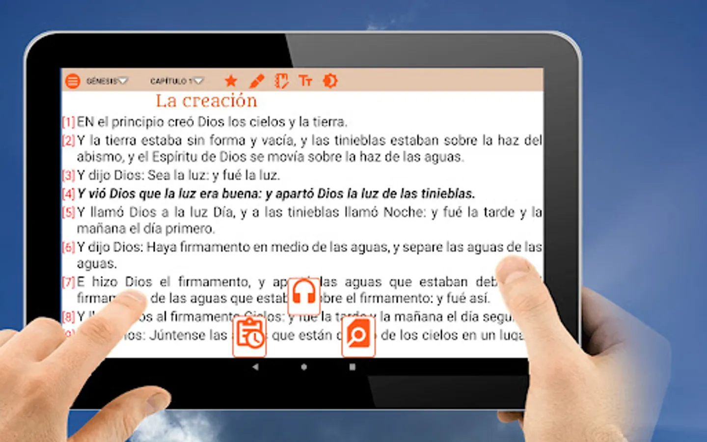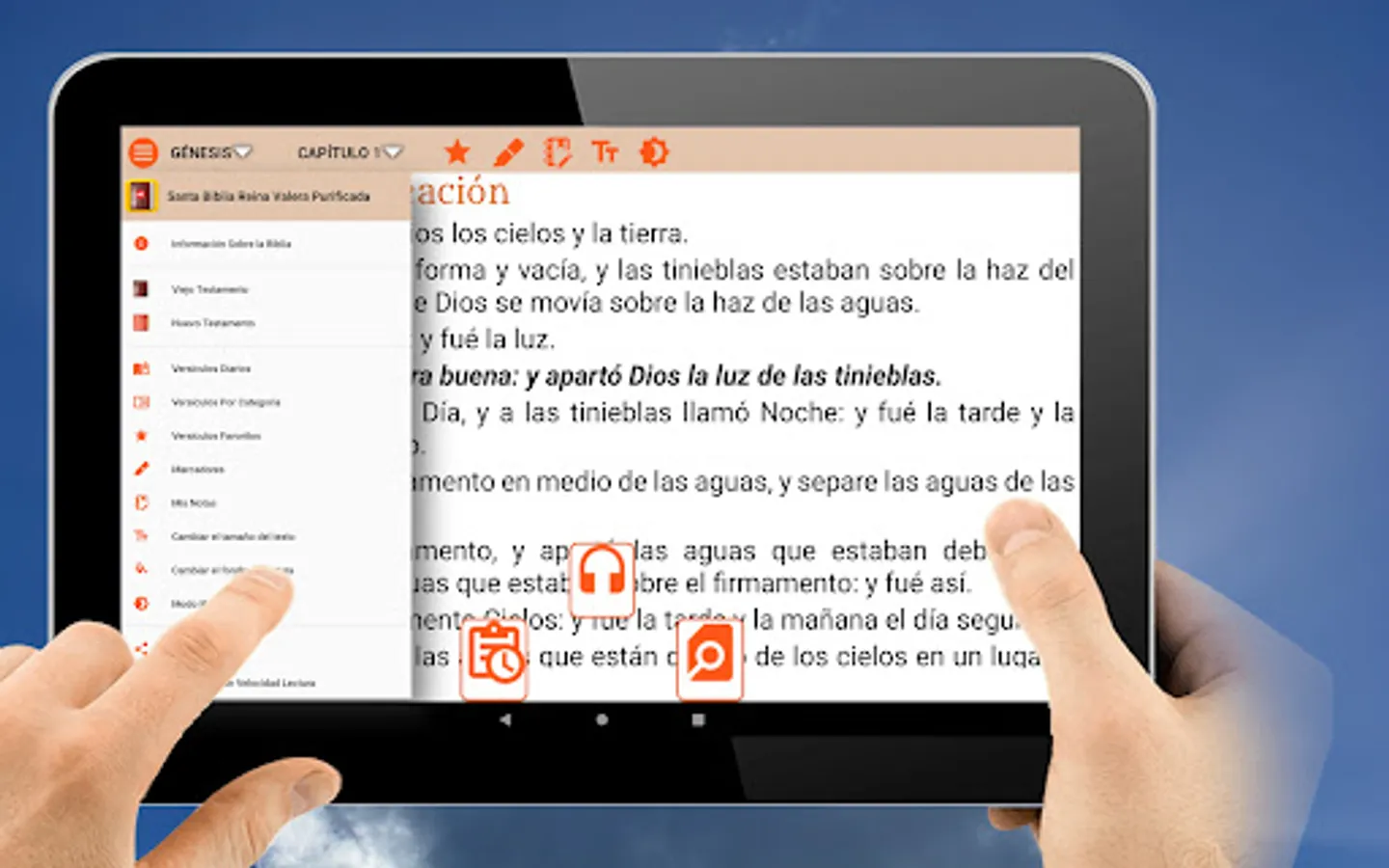 Access to the options menu quickly and easily. Option to change the text size. Book reading background change. Access to favorite chapters and verses. Search for words in books, chapters and verses. Night mode to facilitate reading and reduce screen light.