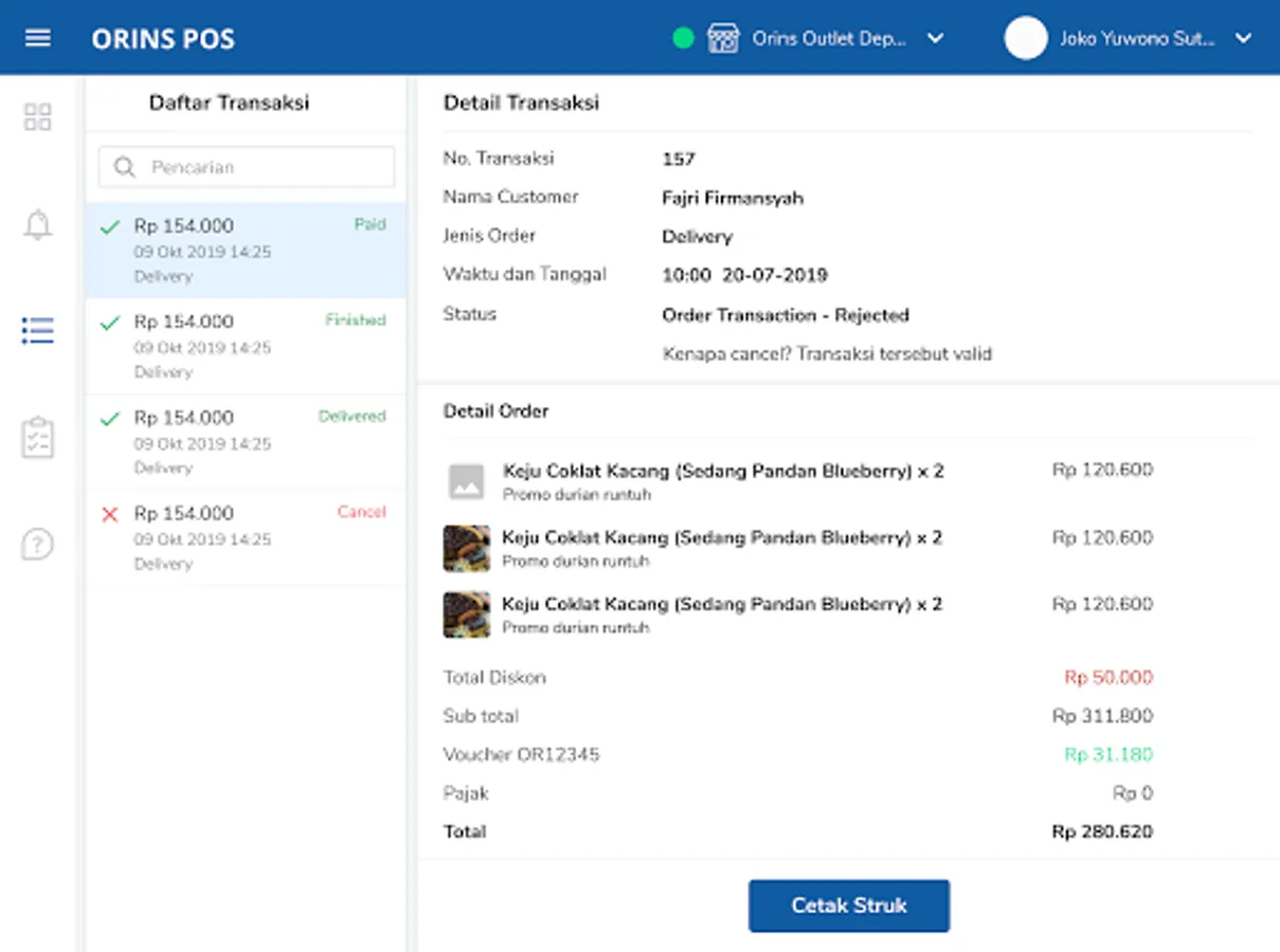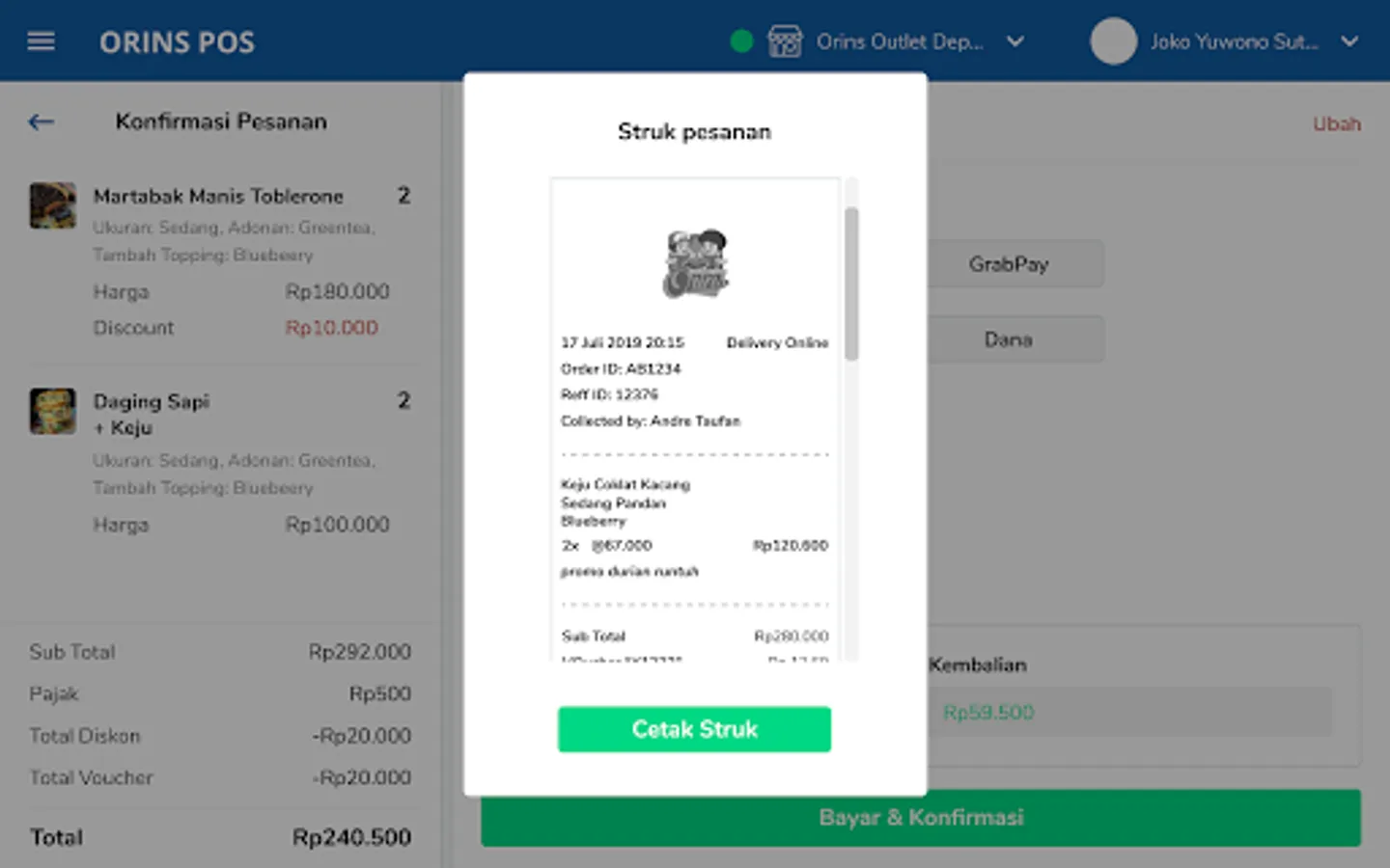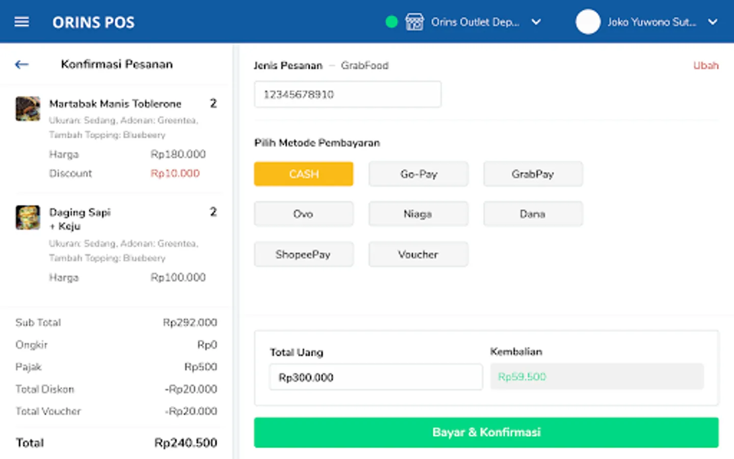 Orins POS is a cashier or point of sale application to support Martabak Orins outlets with features