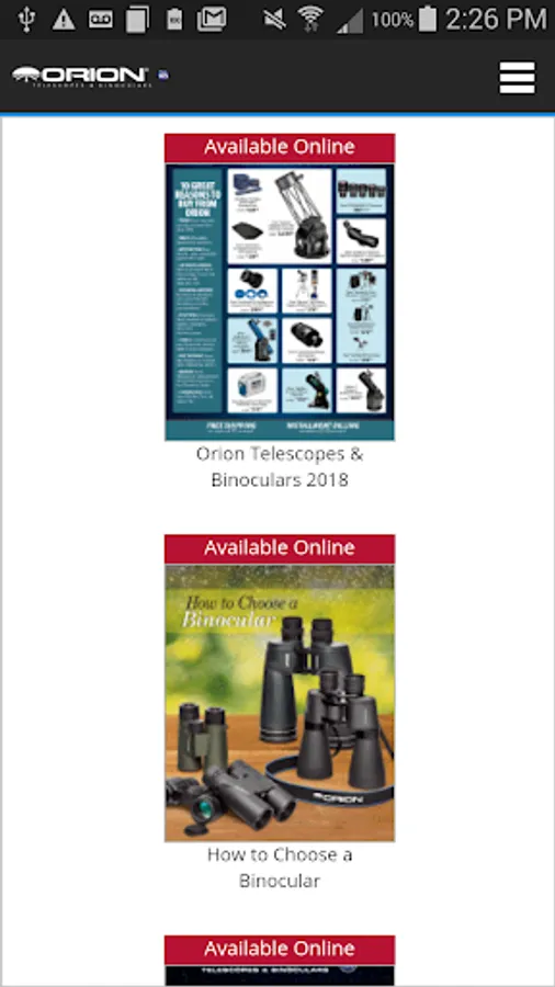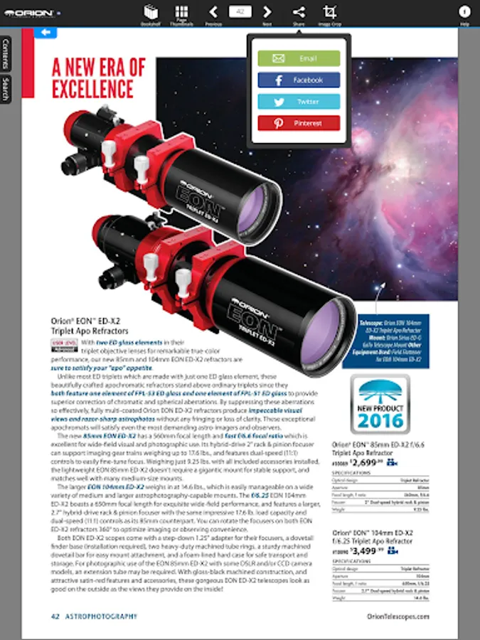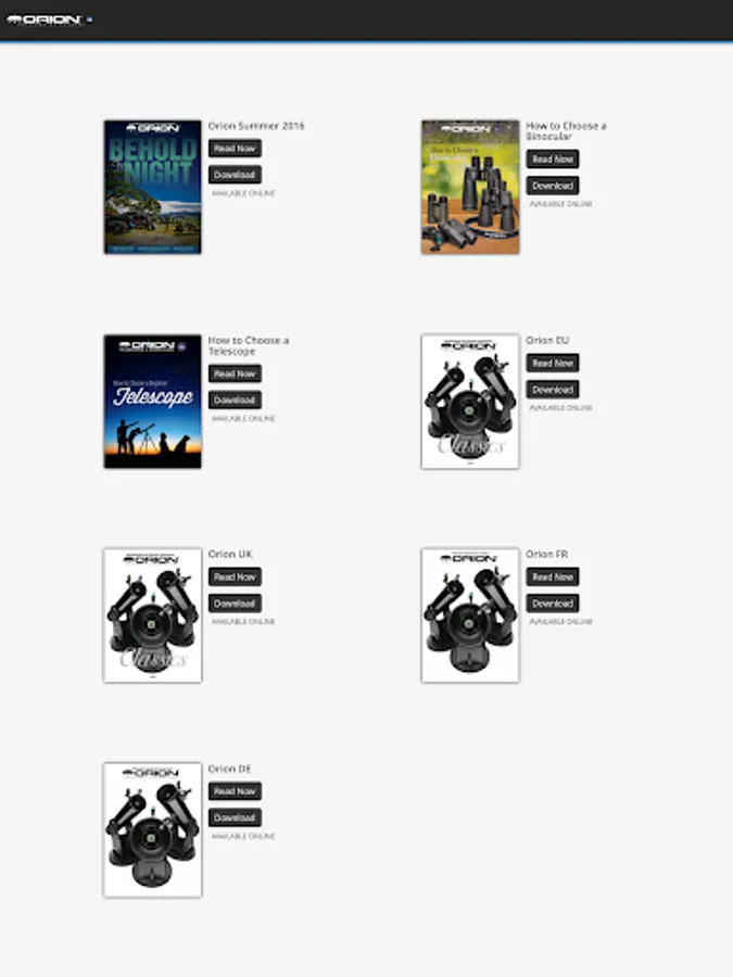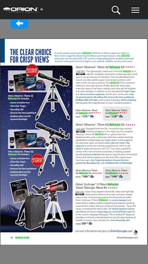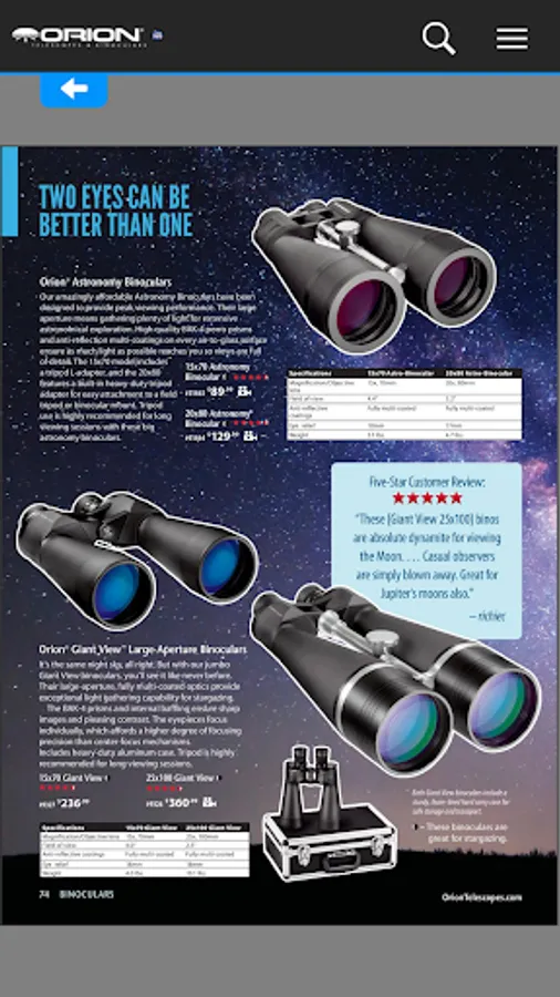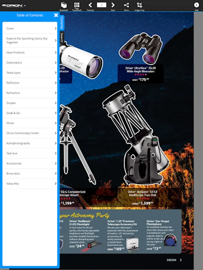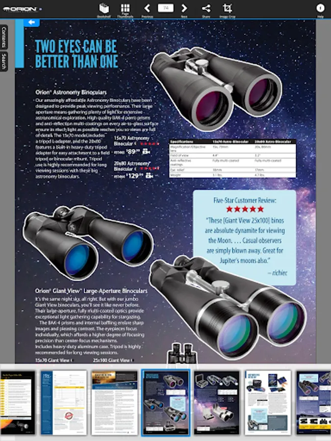 Since 1975 Orion Telescopes & Binoculars has been offering telescopes for sale direct to customers, with an unswerving commitment to best quality products, value and unmatched customer care. Our 100% satisfaction guarantee says it all. Browse and shop for telescopes, binoculars, telescope accessories and astrophotography equipment in our latest interactive Orion catalogs right from your Android device. From our entry level beginner telescopes for amateur astronomers to our Dobsonian telescopes to our most advanced Cassegrain telescopes and accessories, you can find the best telescope for you. Zoom on product details, bookmark favorites, watch featured product videos, and purchase with just a touch.