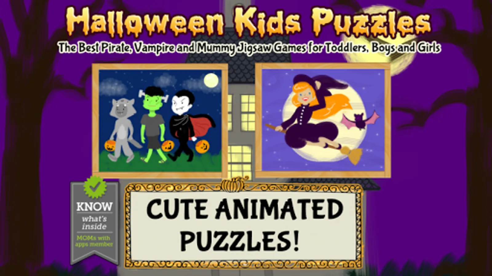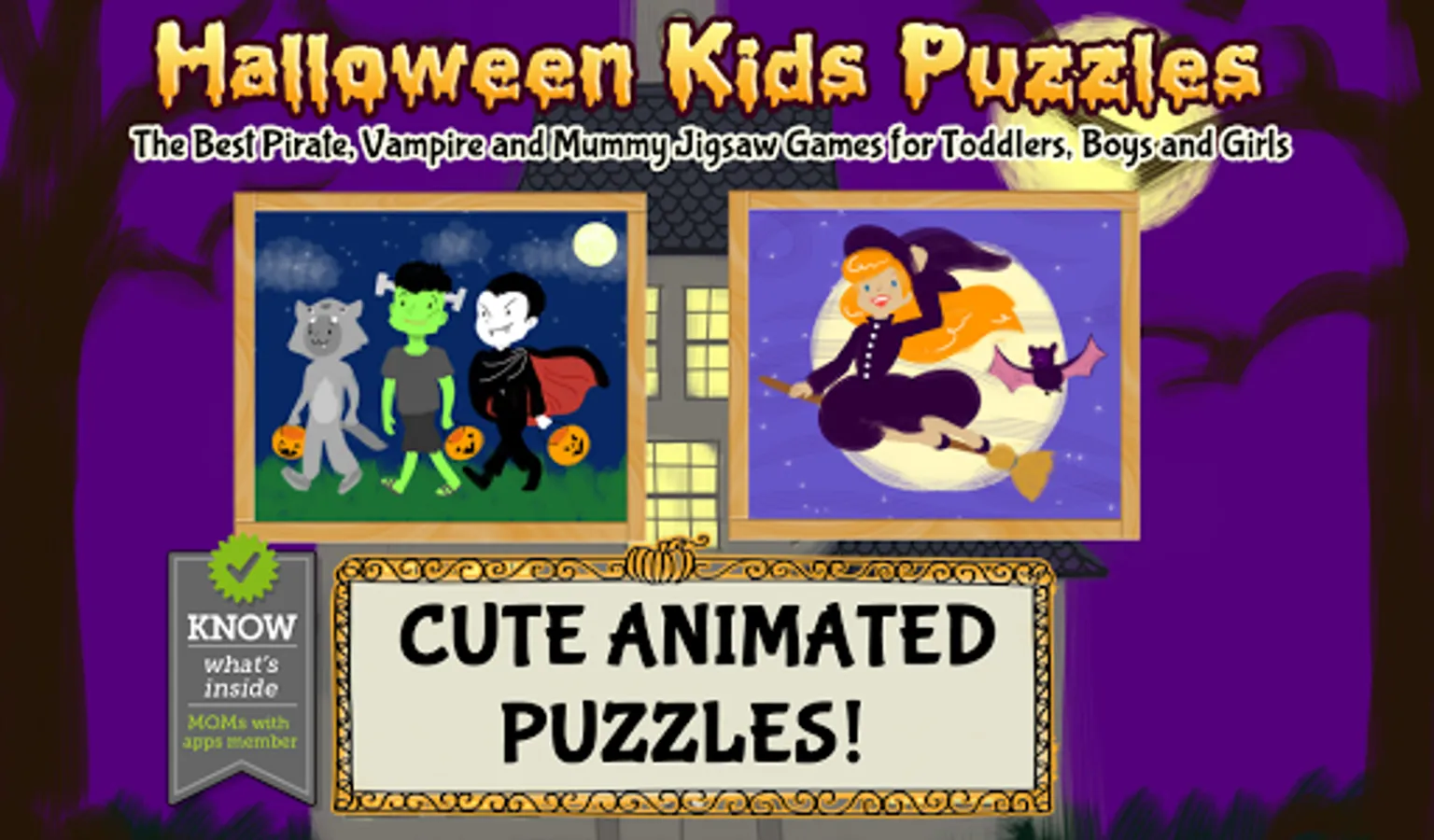Get your kids in the Halloween spirit this season with this fun new puzzle app featuring witches, mummies, Frankenstein, Count Dracula and a few black cats for good (or bad?) luck. Kids, toddles and, preschoolers ages 1-6 will love when the puzzles magically come to life with lively animations, applause and interactive Halloween confetti that bursts into candy corn and sweets when popped.