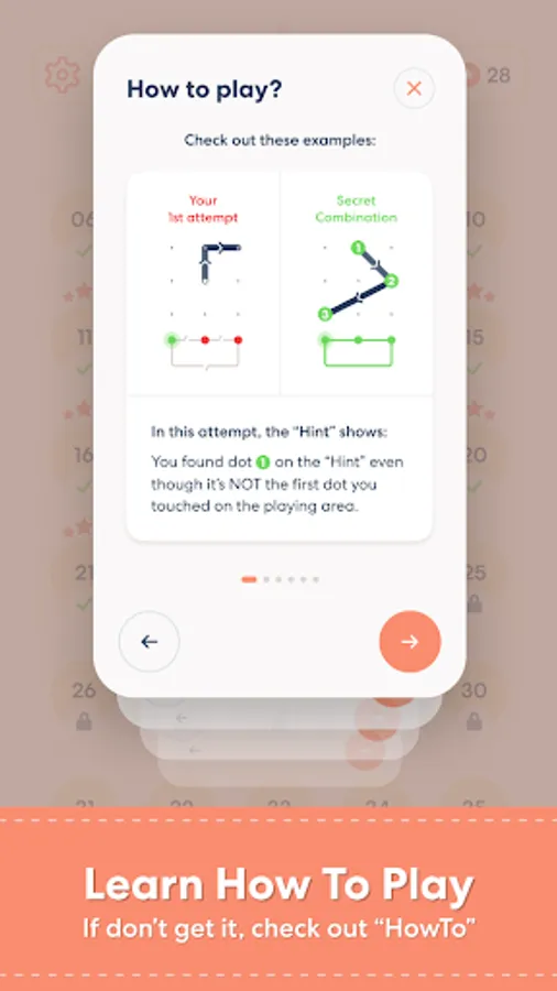 Each level automatically generates a code and you must use logic to crack it. For each attempt a hint will be shown. It will show how many dots you guessed, but they are in the wrong position, and how many dots you guessed and they are in the right position.