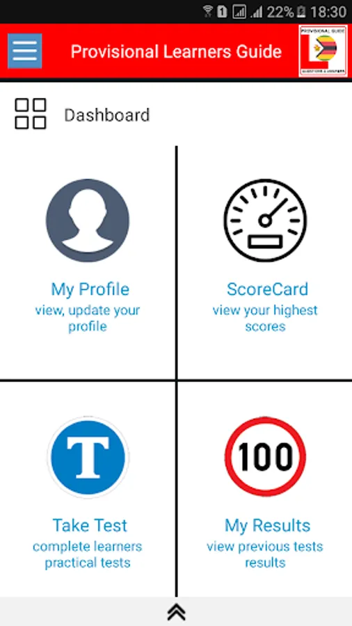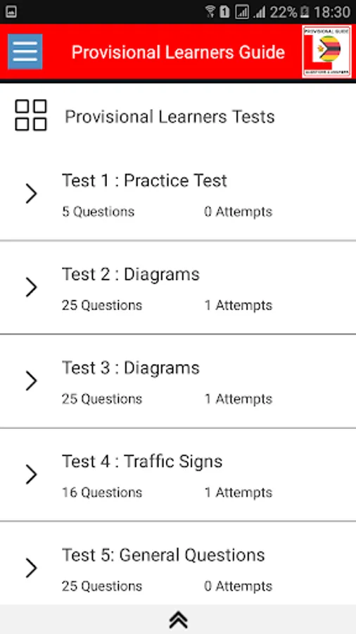 The app includes a lot of multiple-choice questions similar to those asked in the Vehicle Inspection Department (VID) testing official learner's test. Questions are divided into different tests and categories e.g Diagram Questions, Road Signs and General Questions.