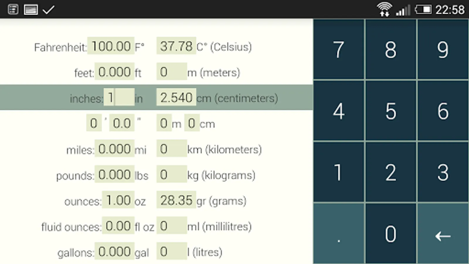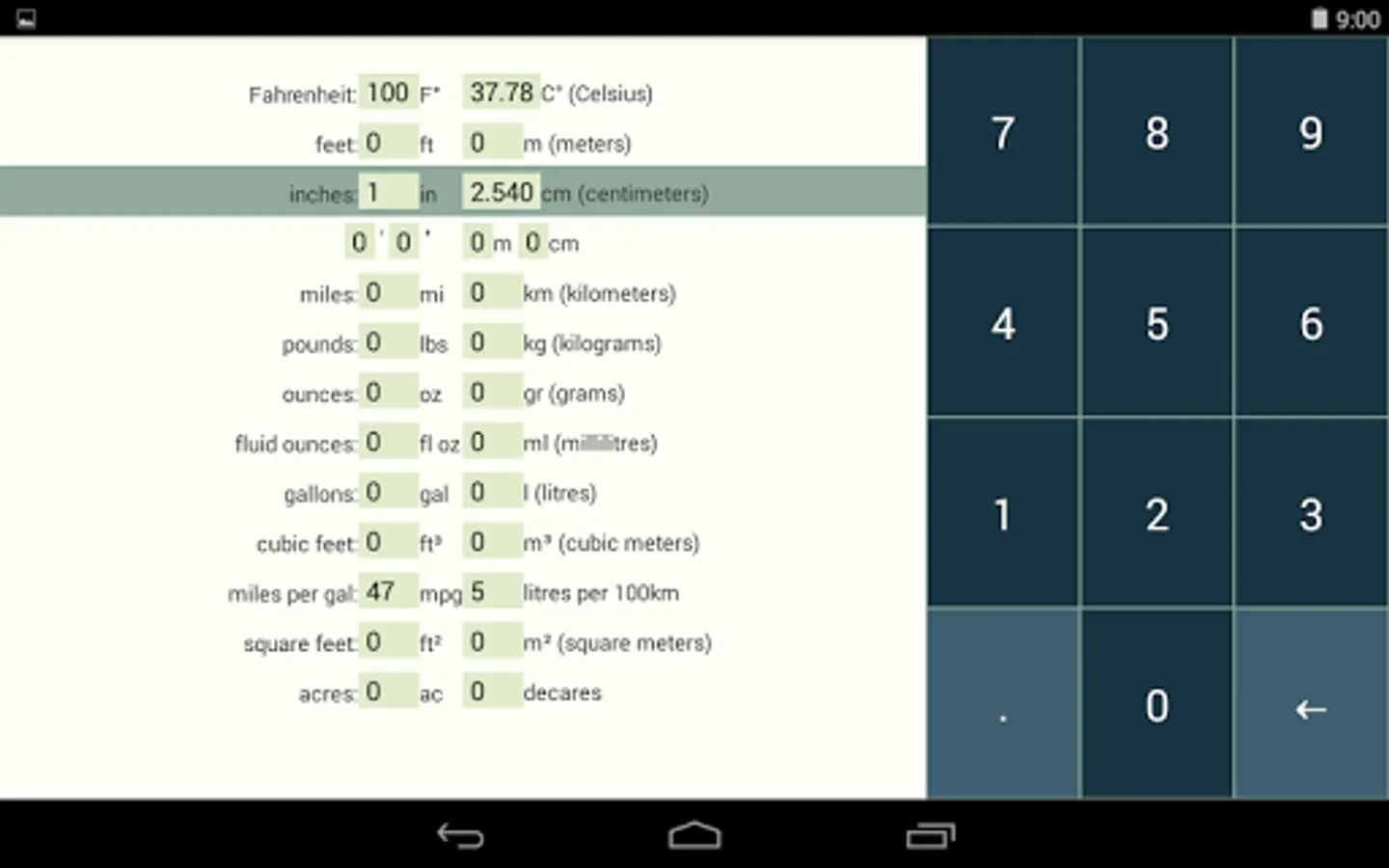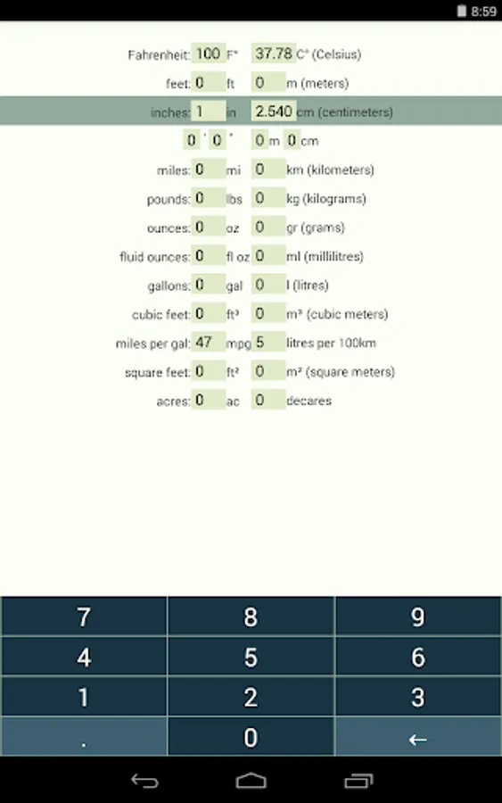 The converter includes all the units in common every-day use and nothing more. You don't need to scroll through complex menus full of arcane units you've never heard of. All the conversions are literally a tap away.
