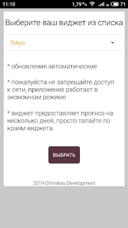 The weather from all around the world in your app, no limits. Wherever you are, two taps separate you from a nice widget on your screen, connected to certain place on the map. The weather updates automatically, no ads, 5 day forecast is right on the cell-sized widget! Saves enegry, makes server requests only when it's necessary. It's also free of any notifications.
