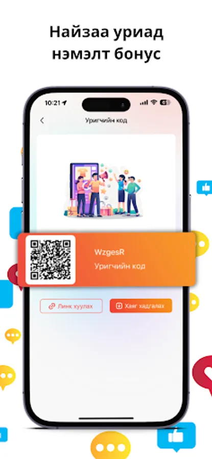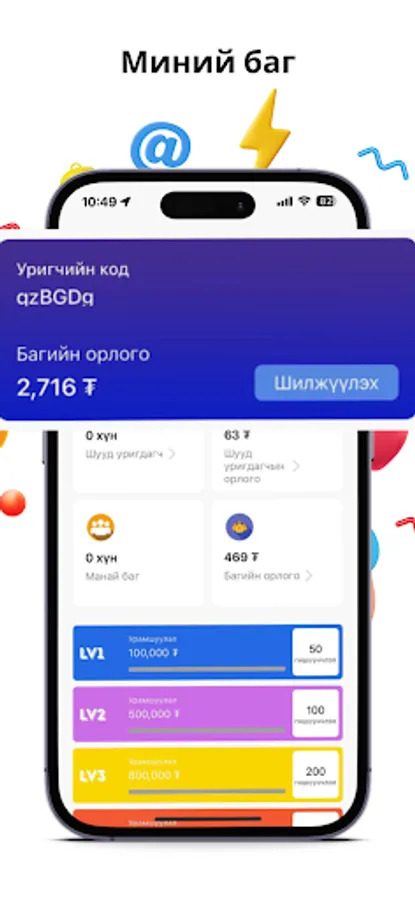 Хуваалцах: Бусадтай хуваалцаж байнгын нэмэлт урамшуулал авах урамшууллын систем. Хэрэглэгч бүртгэл үүсгэн бусдад түгээснээр худалдан авалт бүрээс, урилт бүрээс, хөрөнгө оруулалт бүрээс урамшуулал хүртэх боломжтой. Урамшуулал цахим хэлбэрээр олгогдох бөгөөд өдөр тутмын нэмэлт орлогоо хянах бүрэн боломжтой.