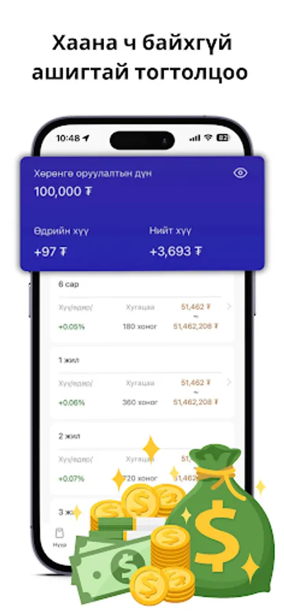 Хөрөнгө оруулалт: Та хөрөнгө оруулалт хэсэгт заагдсан өгөдөлийн дагуу өөрийн хүссэн дүнгээрээ хүссэн хугацаагаараа хөрөнгө оруулалт хийх боломжтой бөгөөд танд банкнаас илүү хадгаламжийн хүүг санал болгож байна. Энэхүү танилцуулга нь таны хөрөнгө оруулалтын хэрхэн найдвартай, тогтвортой өсгөхийг харуулж буй үйл ажиллагааны танилцуулга юм