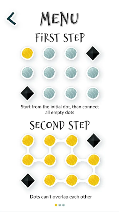 Start drawing a line from the initial dot that is highlighted in yellow and connect all the grey dots avoiding black squares. Select a direction (only vertical and horizontal moves are allowed) and build a path that will connect all the dots on the screen. No timers, no clocks, no stars and no tricks, just pure puzzles for you to enjoy.