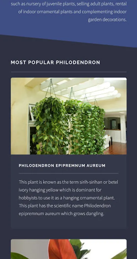 This ornamental plants app provides information related to new house decorating. This app presents all the information about philodendron plant guide such as identification (types and morphology), ornamental plant disease, and growing technique.