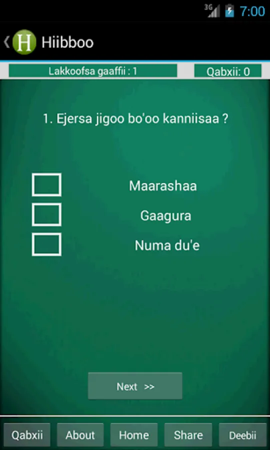 Hiibboo is equivalent to Riddle in English, almost :) Hiibboo or Riddle is a form of guessing game that has been a part of the folklore of most cultures from ancient times. The App contains few Hiibboo questions in Afan Oromo language.